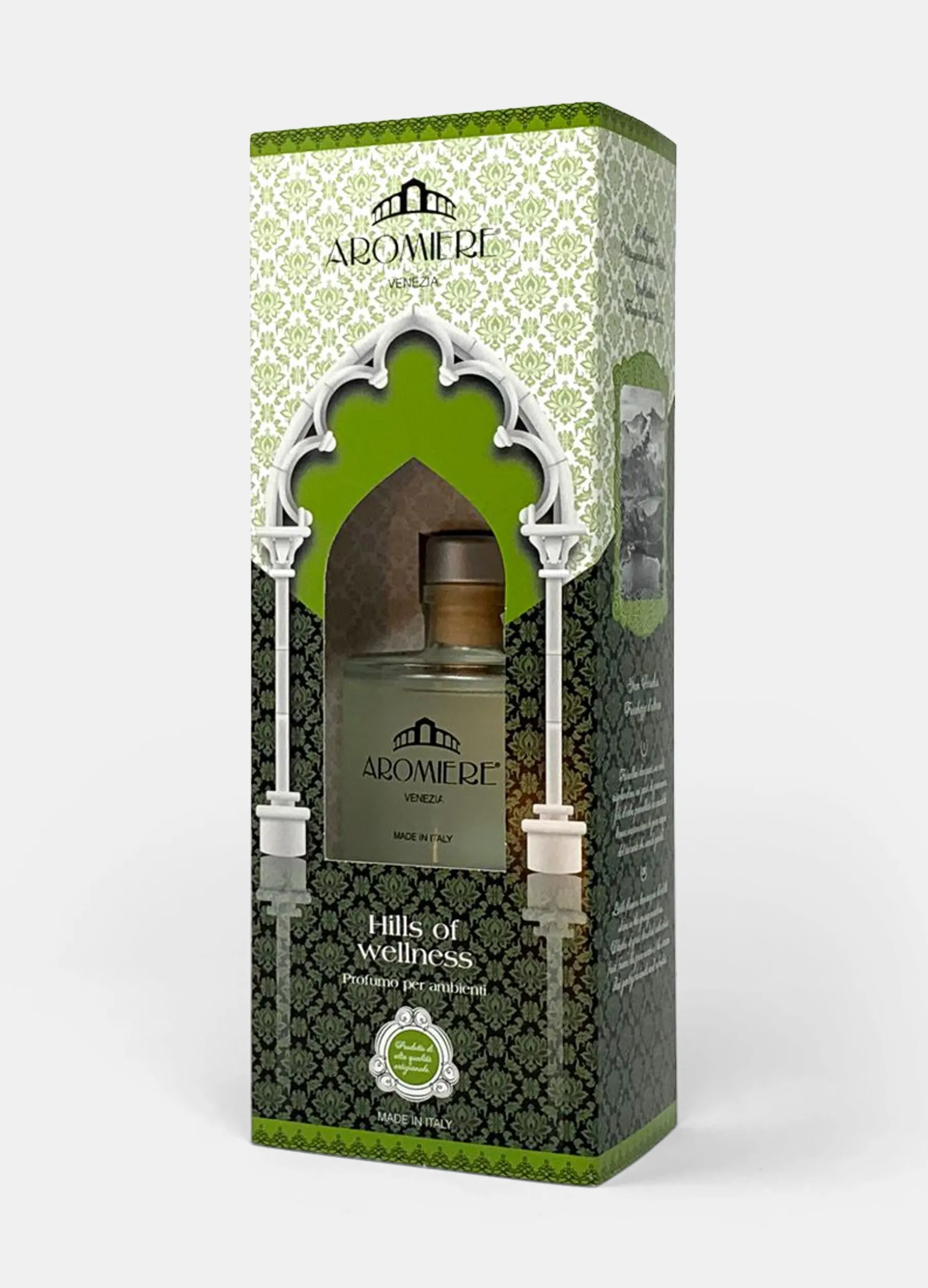 Diffusore per ambienti Aromiere Venezia aroma “Hills of wellness”. Contenitore in vetro. Capacità 100ml. Altezza 25cm. Made in Italy.