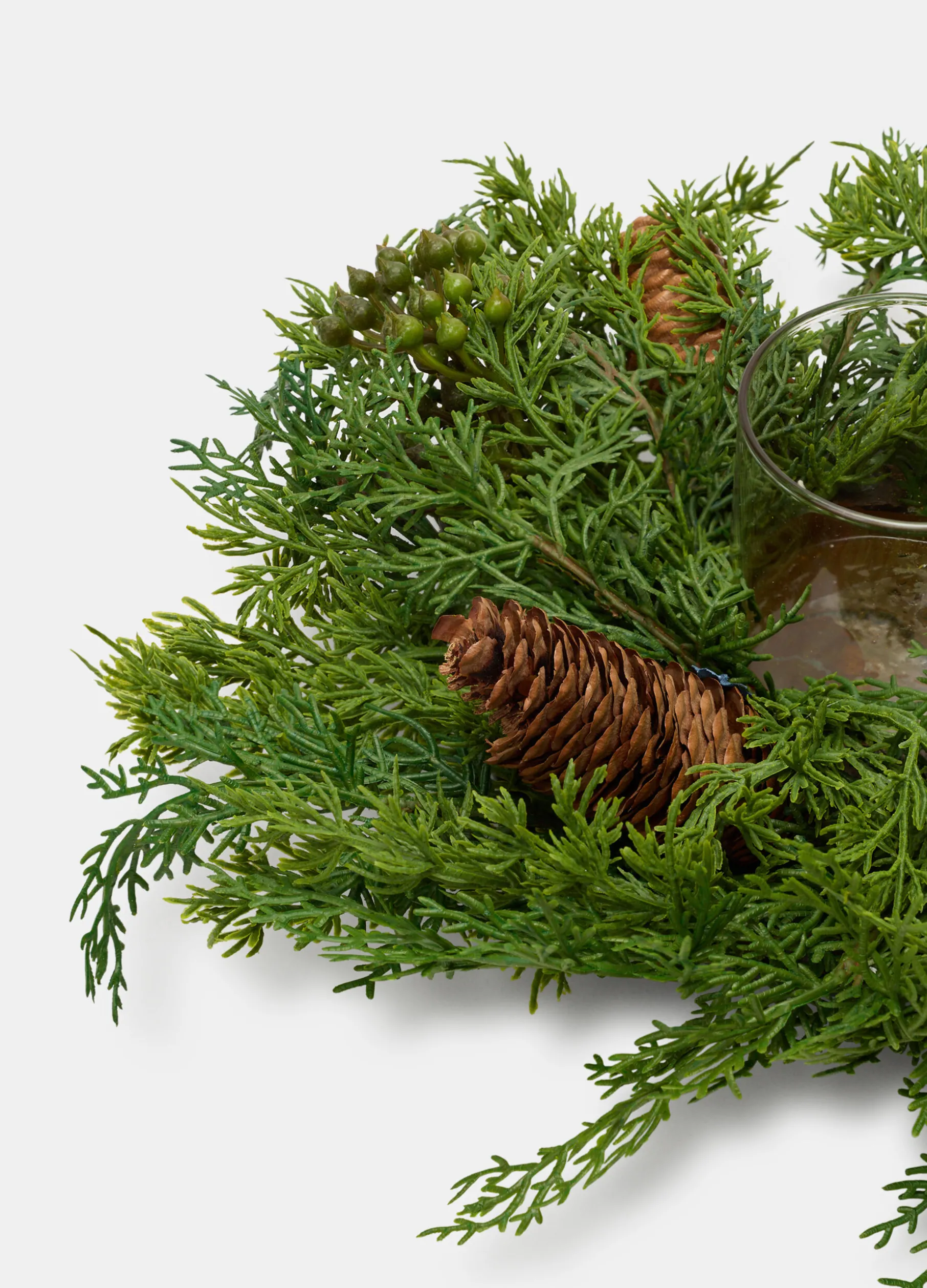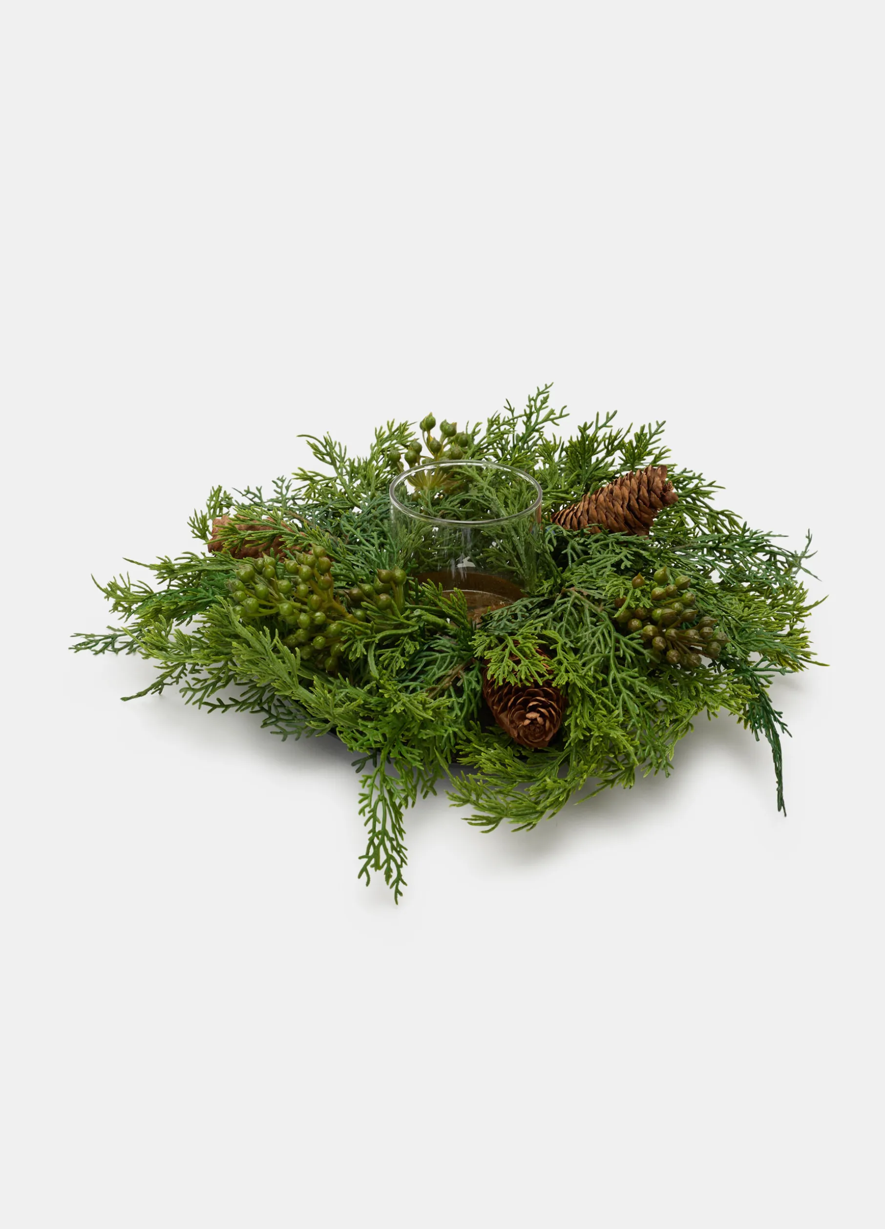 Centrotavola elegante e discreto con rami di pino e abete, pigne e bacche invernali, perfetto per rallegrare l’atmosfera di pranzi e cene festive. Con portacandela trasparente al centro. Diametro: 11 cm.