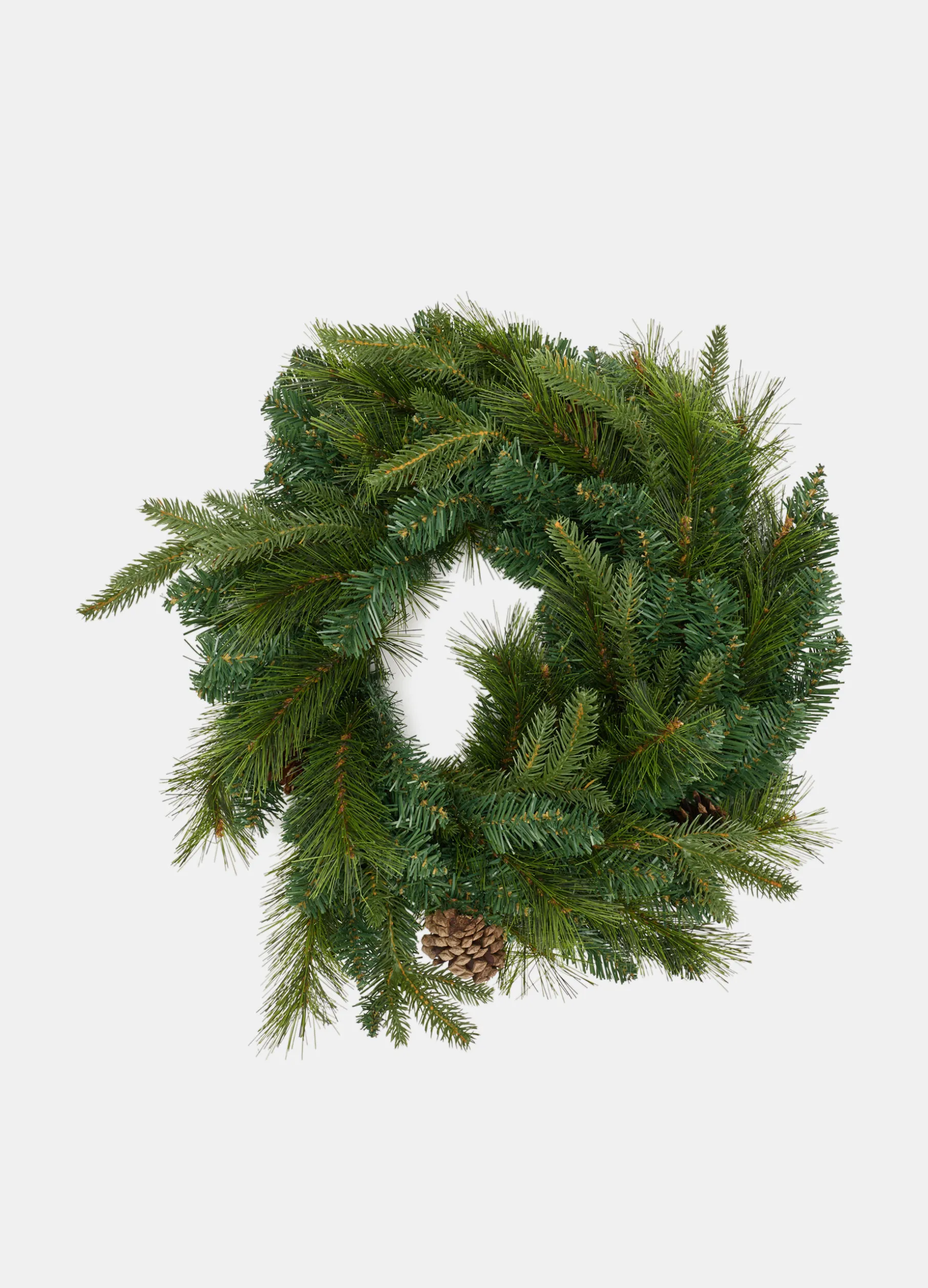Allegra ghirlanda natalizia composta da rami finti di pino e abete e arricchita da pigne e dettagli che ne aumentano il fascino rustico e accogliente. Dimensioni: 45 x 30 cm.