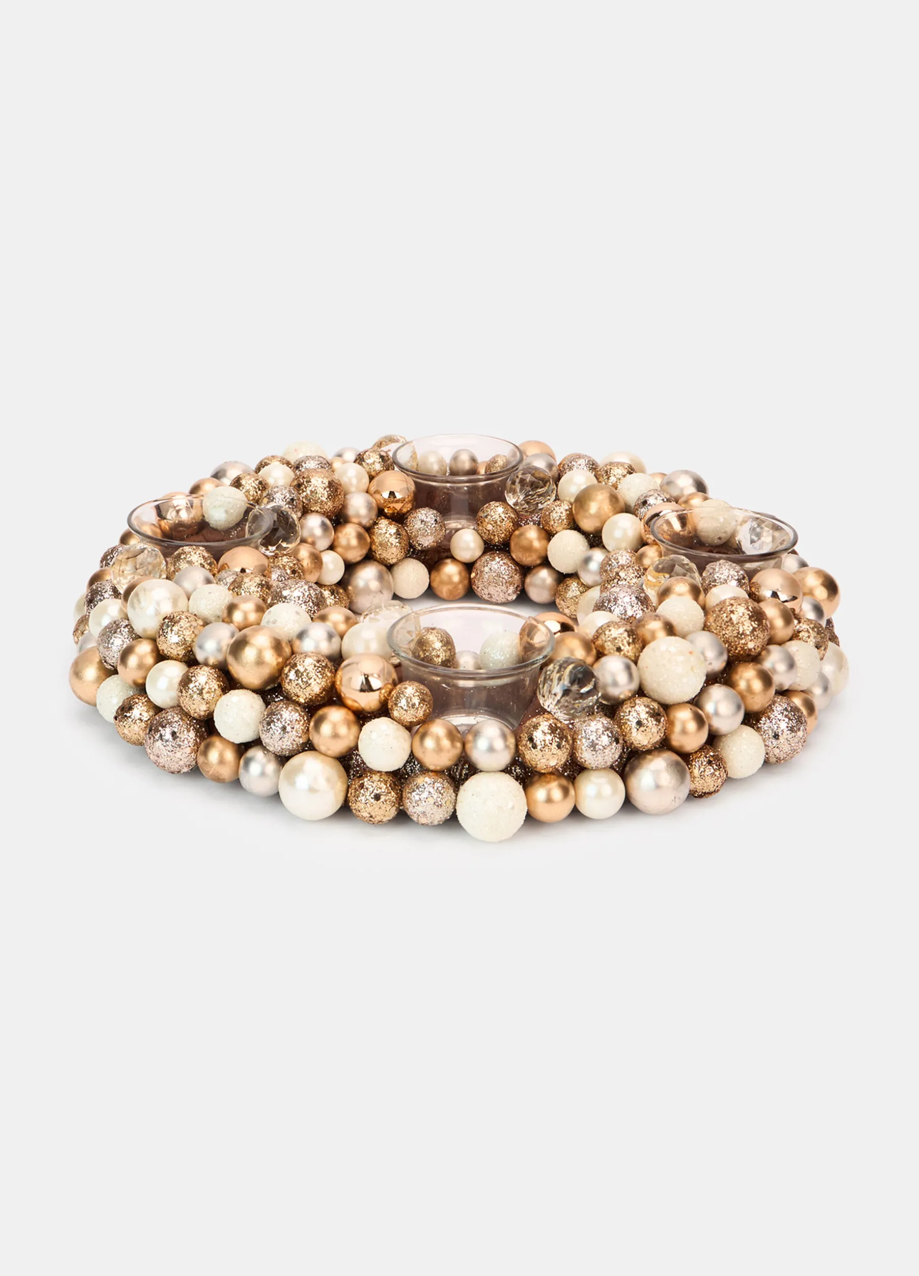 Portacandele a forma di ghirlanda, ideale come centrotavola o per rallegrare l’atmosfera domestica nel periodo delle feste, composto da una moltitudine di perline trasparenti, dorate o glitterate, con quattro bicchierini in vetro per candeline. Dimensioni: 6 x 34 cm.
