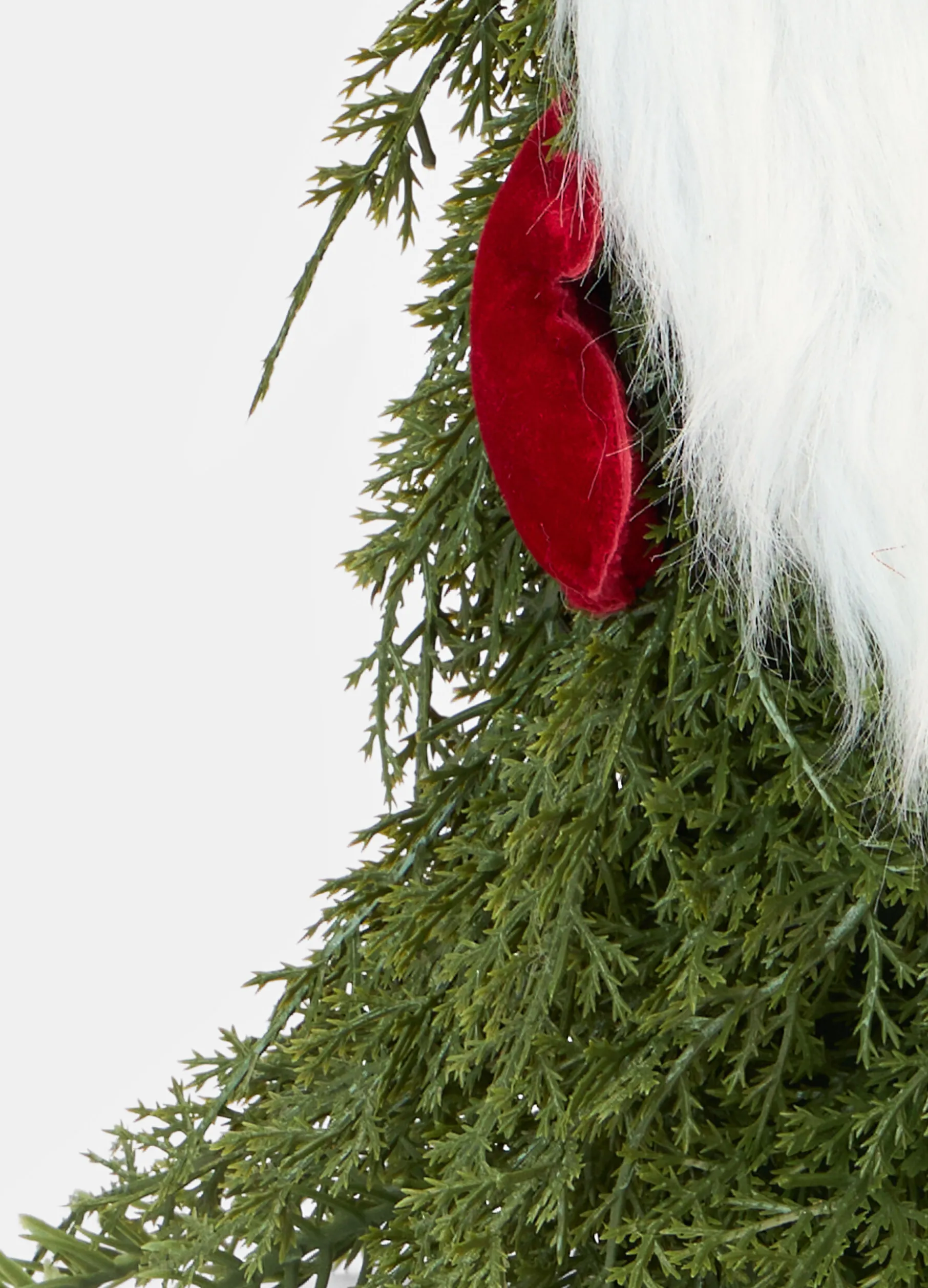 Allegro gnomo decorativo in peluche, che richiama le atmosfere magiche e festose del Natale, caratterizzato dal tipico cappello a punta, barba folta e rametti verdi. Dimensioni: 22 x 55 x 15 cm.