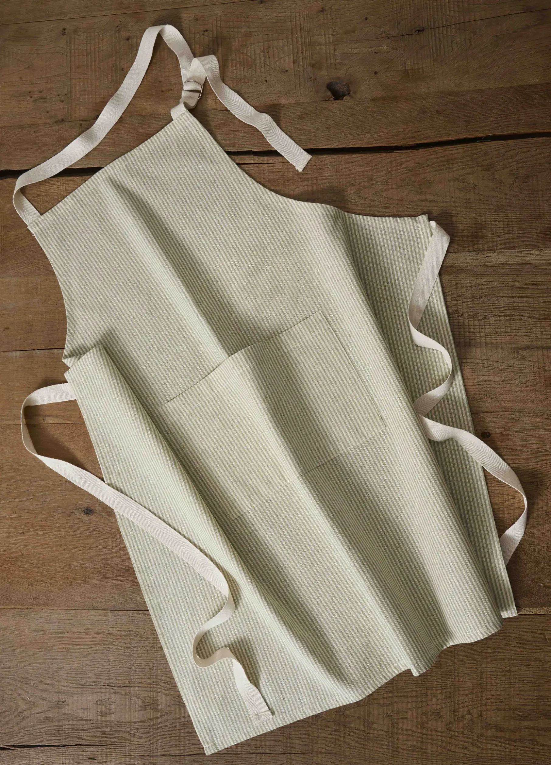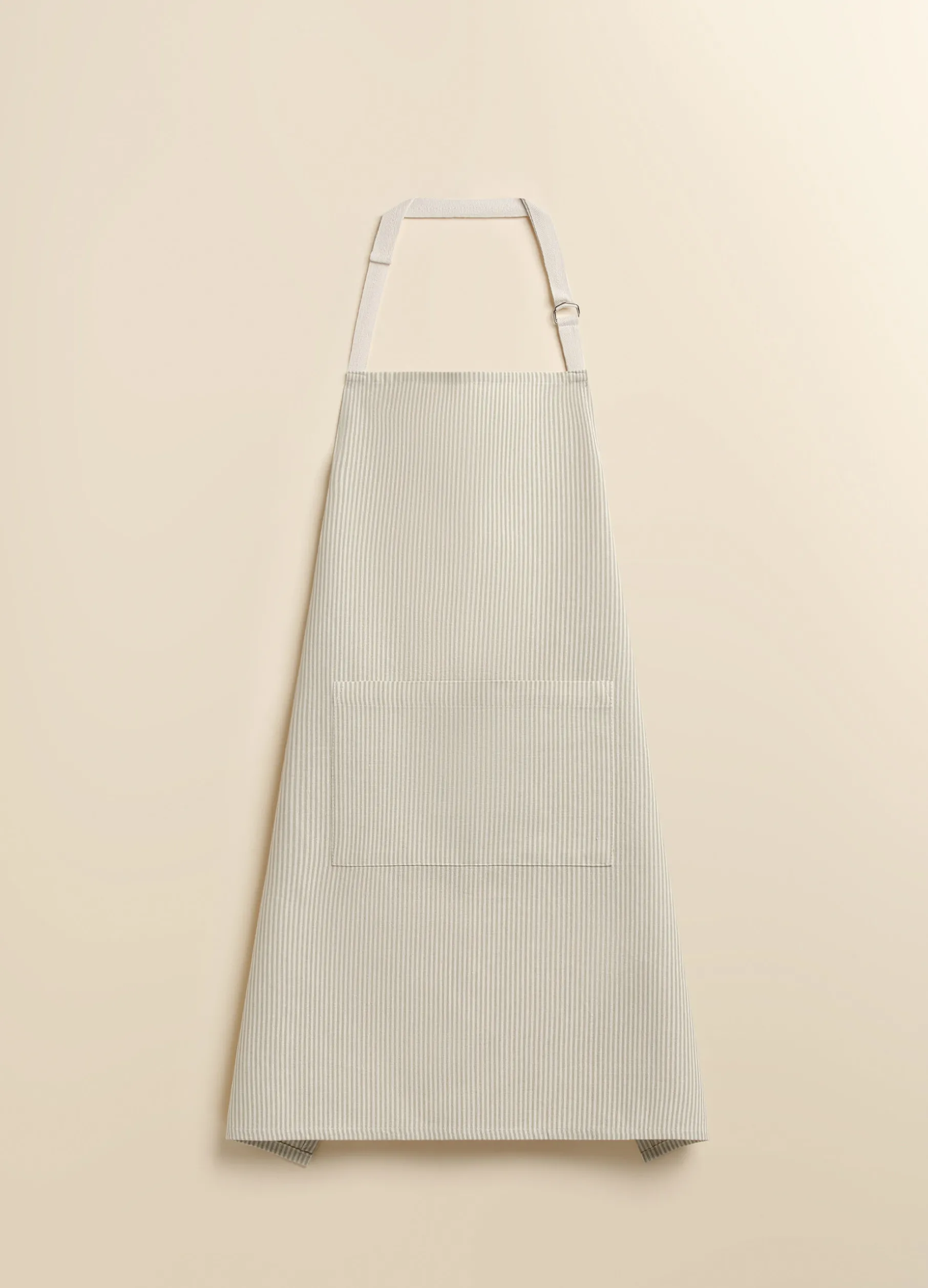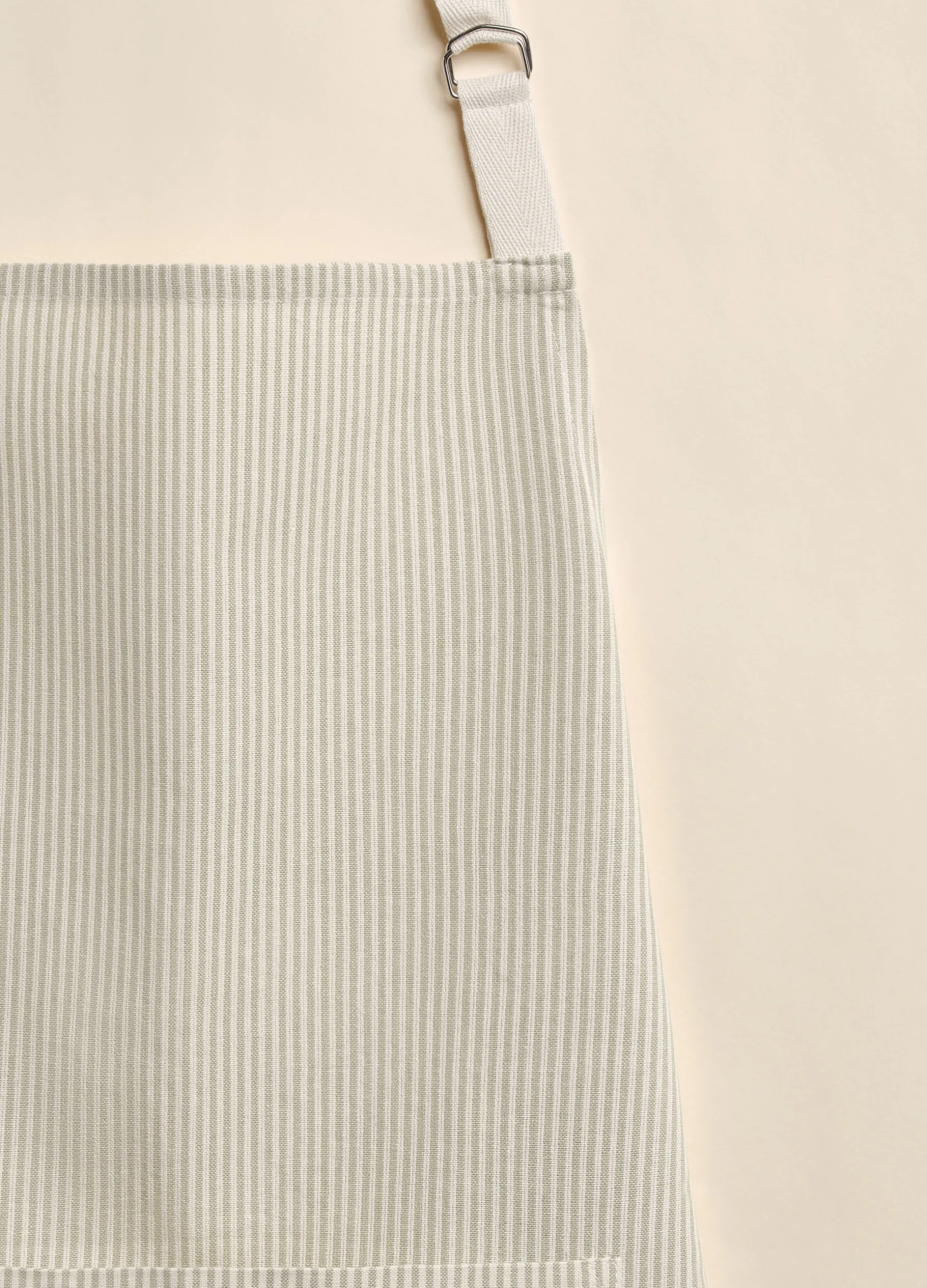 Grembiule da cucina realizzato in puro cotone bio, un materiale versatile e resistente arricchito dal motivo a righe sottili bianche e verde chiarissimo. Con tascone sul davanti, è completato da allacciatura sul retro e da fibbia regolare al collo. Dimensioni: 85 x 75 cm.