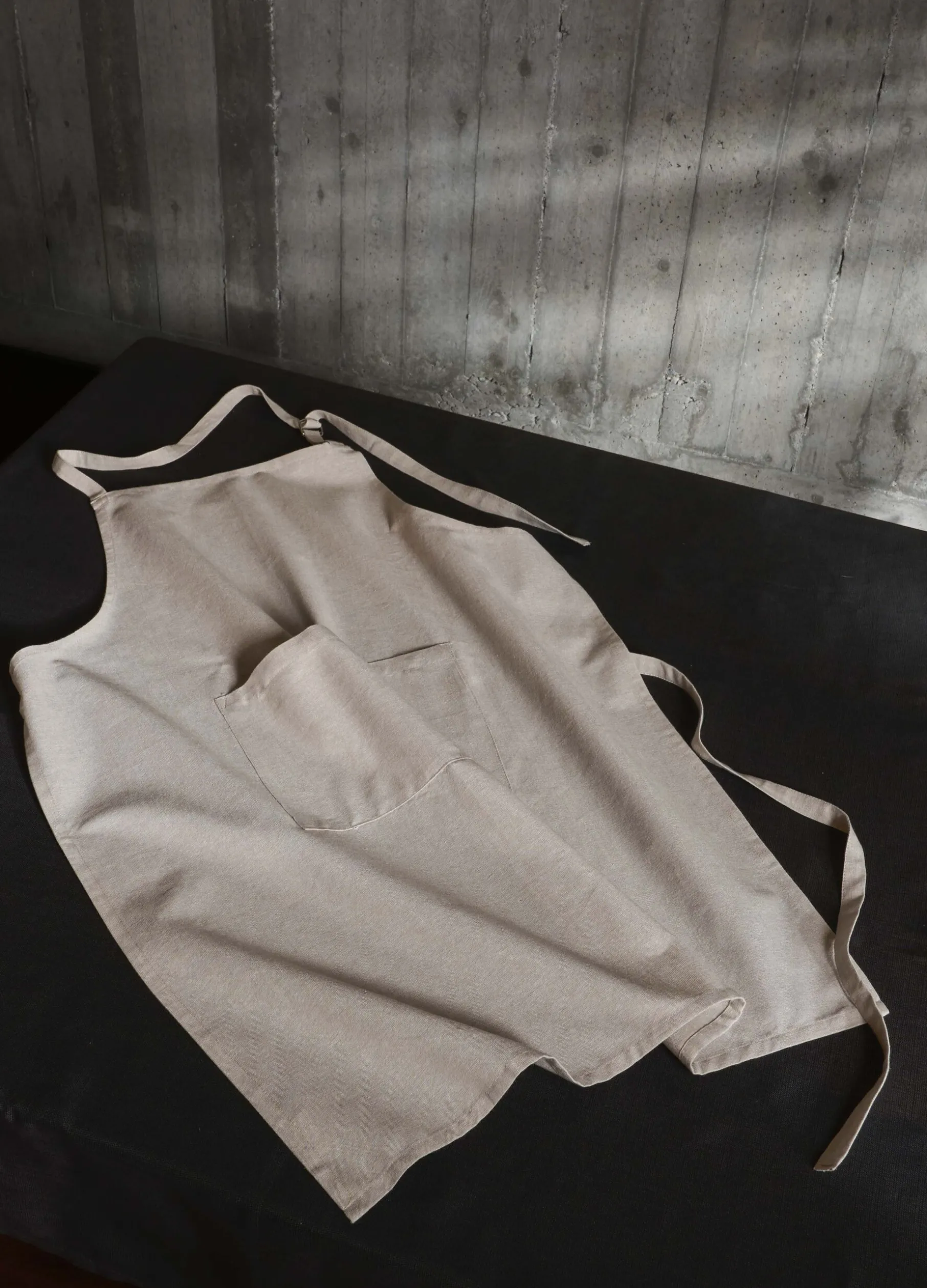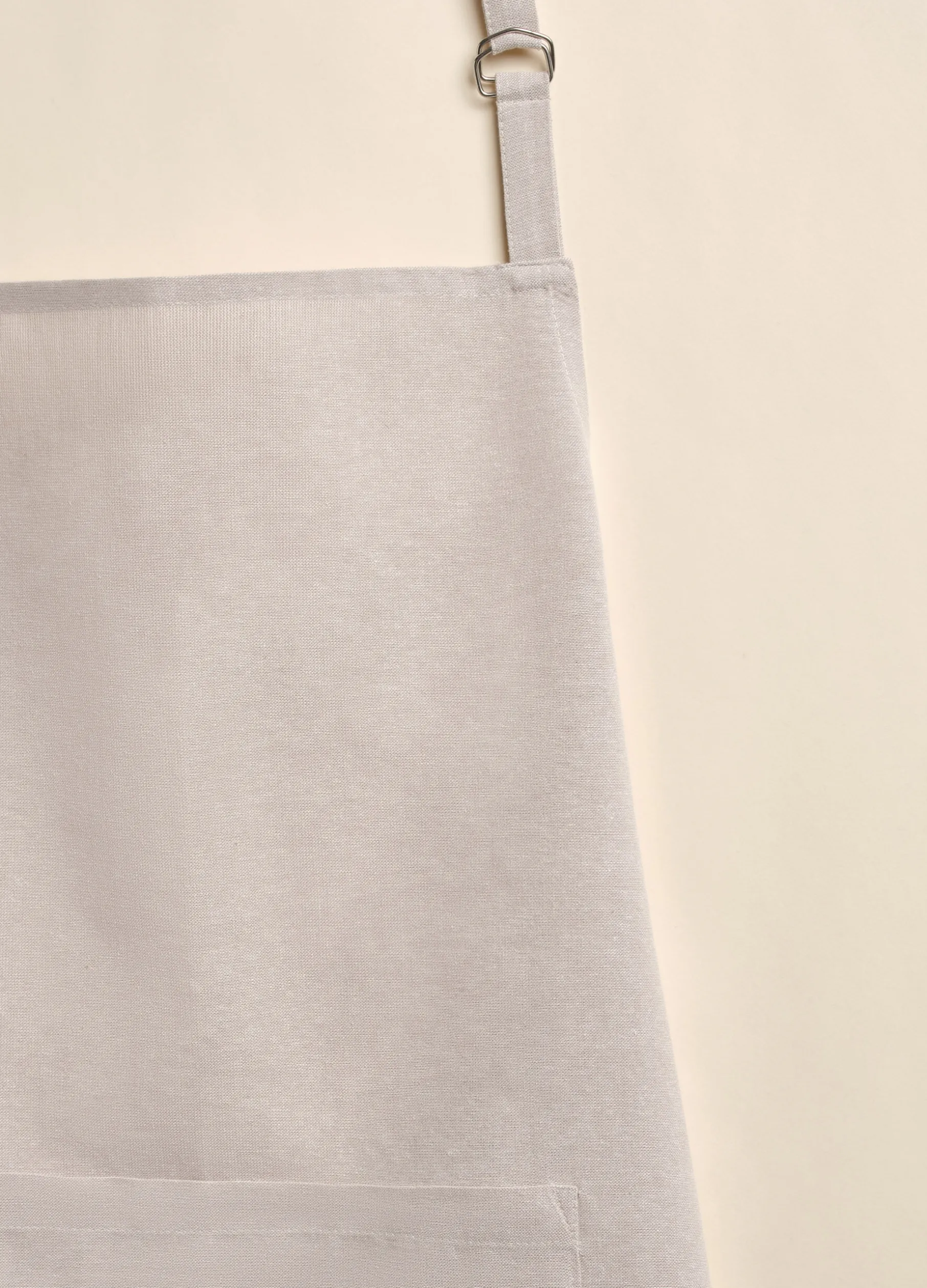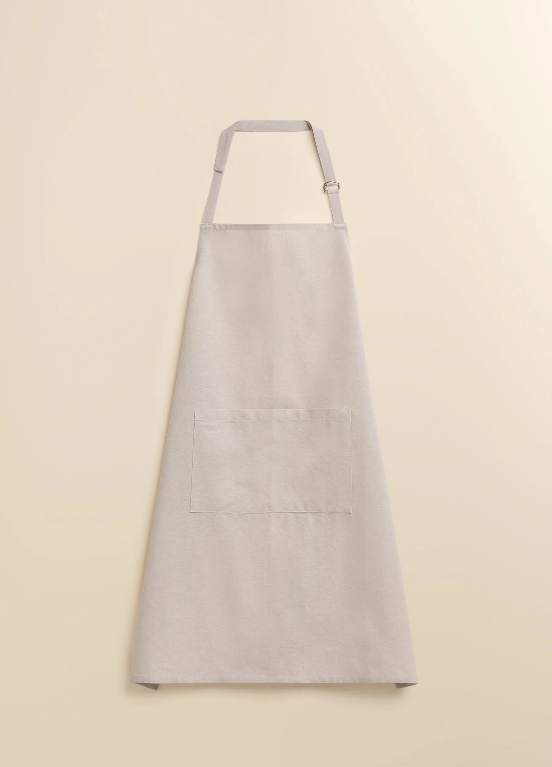 Grembiule da cucina in puro cotone beige mélange, robusto e resistente, perfetto per l’utilizzo quotidiano. Con allacciatura in vita, nastro regolabile sul collo e tascone frontale.