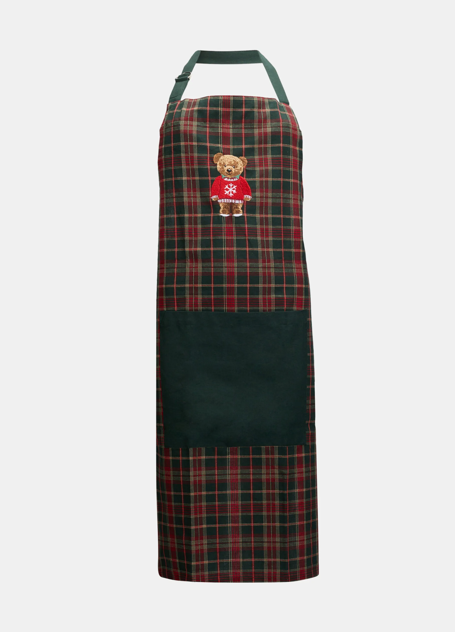 Grembiule da cucina lungo sotto il ginocchio in puro cotone, versatile e resistente, caratterizzato dal tradizionale motivo tartan nei toni del verde scuro e del rosso, più festoso e allegro grazie all’applicazione Teddy Bear ricamata sul davanti. Con tasca frontale e fibbia regolabile al collo. Dimensioni: 90 x 70 cm.