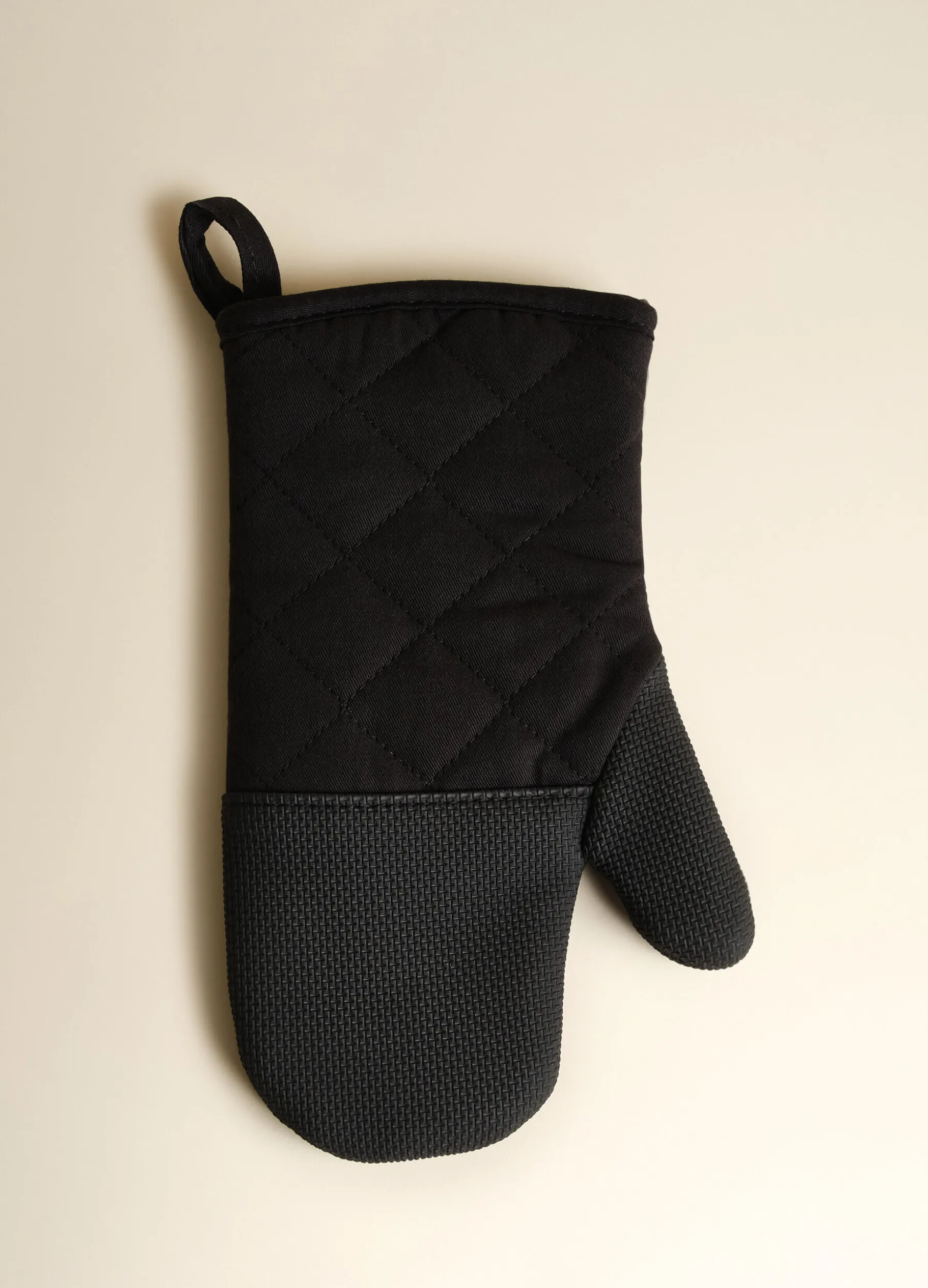 Guanto da cucina nero pratico e funzionale, realizzato in un mix di cotone resistente e neoprene, un materiale impermeabile che isola dal calore, estremamente funzionale grazie anche alla texture irregolare che migliora la presa. Con laccetto per appenderlo. Dimensioni: 21 x 17,5 cm.