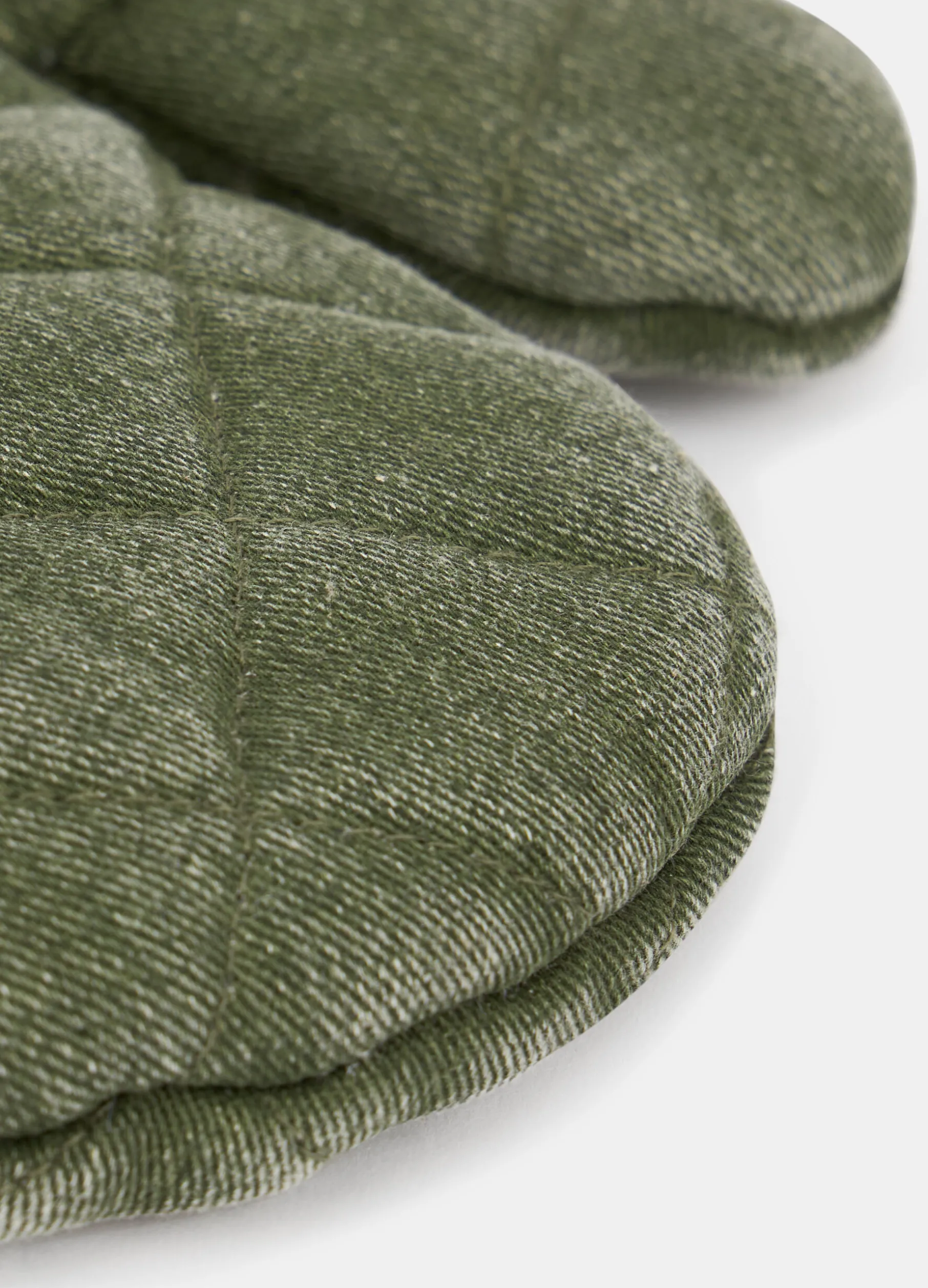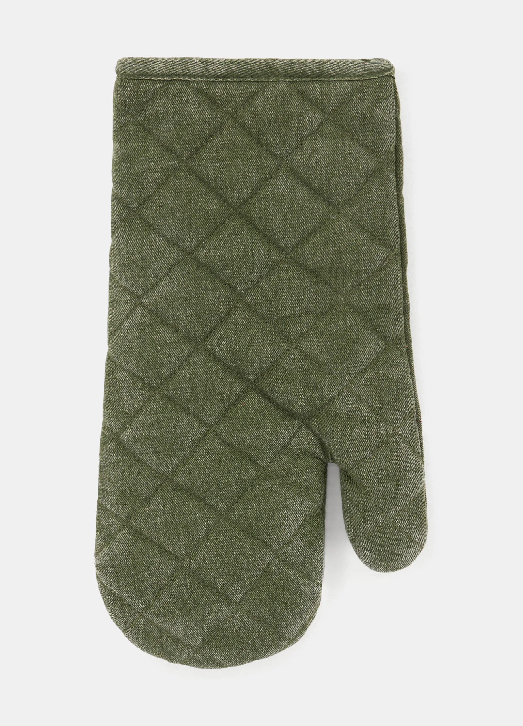 Guanto da forno verde scuro realizzato in cotone lavato: la particolare lavorazione di questo tessuto ricorda l’aspetto del denim, con una texture liscia e una colorazione sfumata. Completo di leggera imbottitura e trapuntatura per renderlo più pratica e funzionale. Dimensioni: 32 x 18 cm.