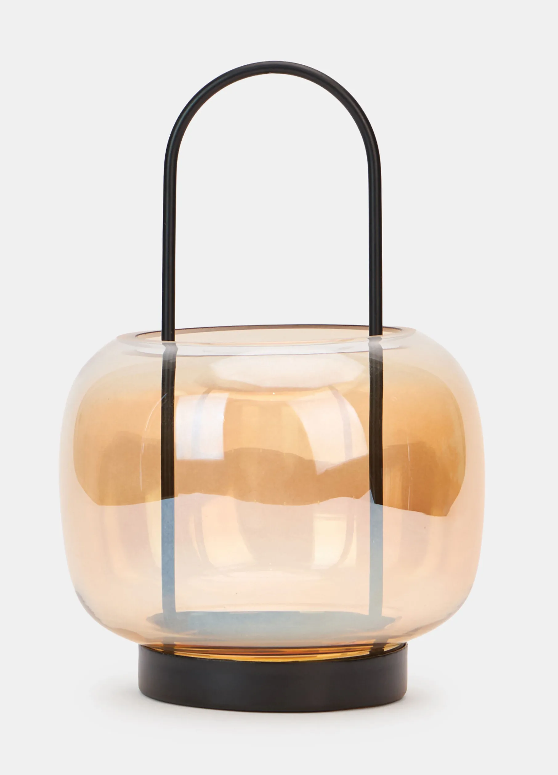 Lanterna rotonda in vetro giallo caldo e intenso, con manico e base rotonda in metallo, completa di spazio per inserire una candela. Altezza: 24 cm.