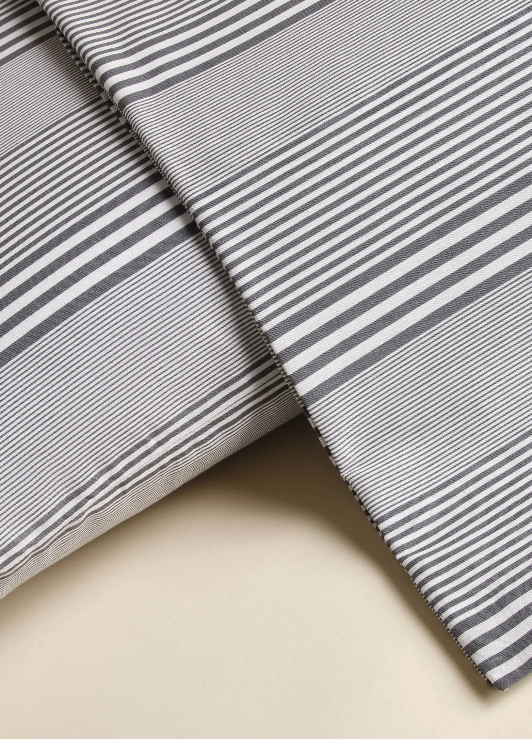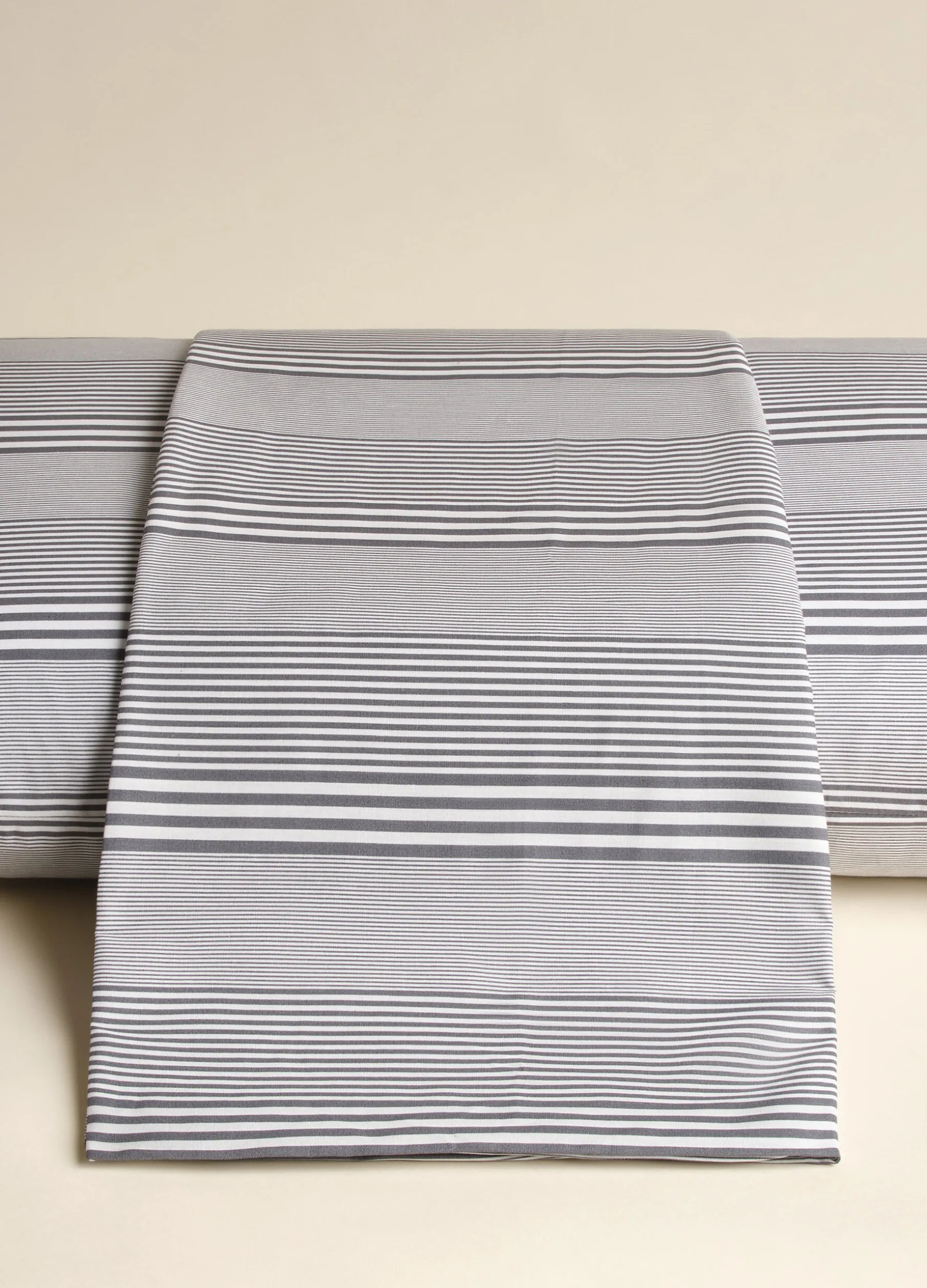 Lenzuolo in puro cotone per letto matrimoniale arricchito da un originale motivo a righe grigie di spessori diversi sul fondo bianco. Il filato di cotone è fresco e leggero, per garantire comfort e riposo ottimali.