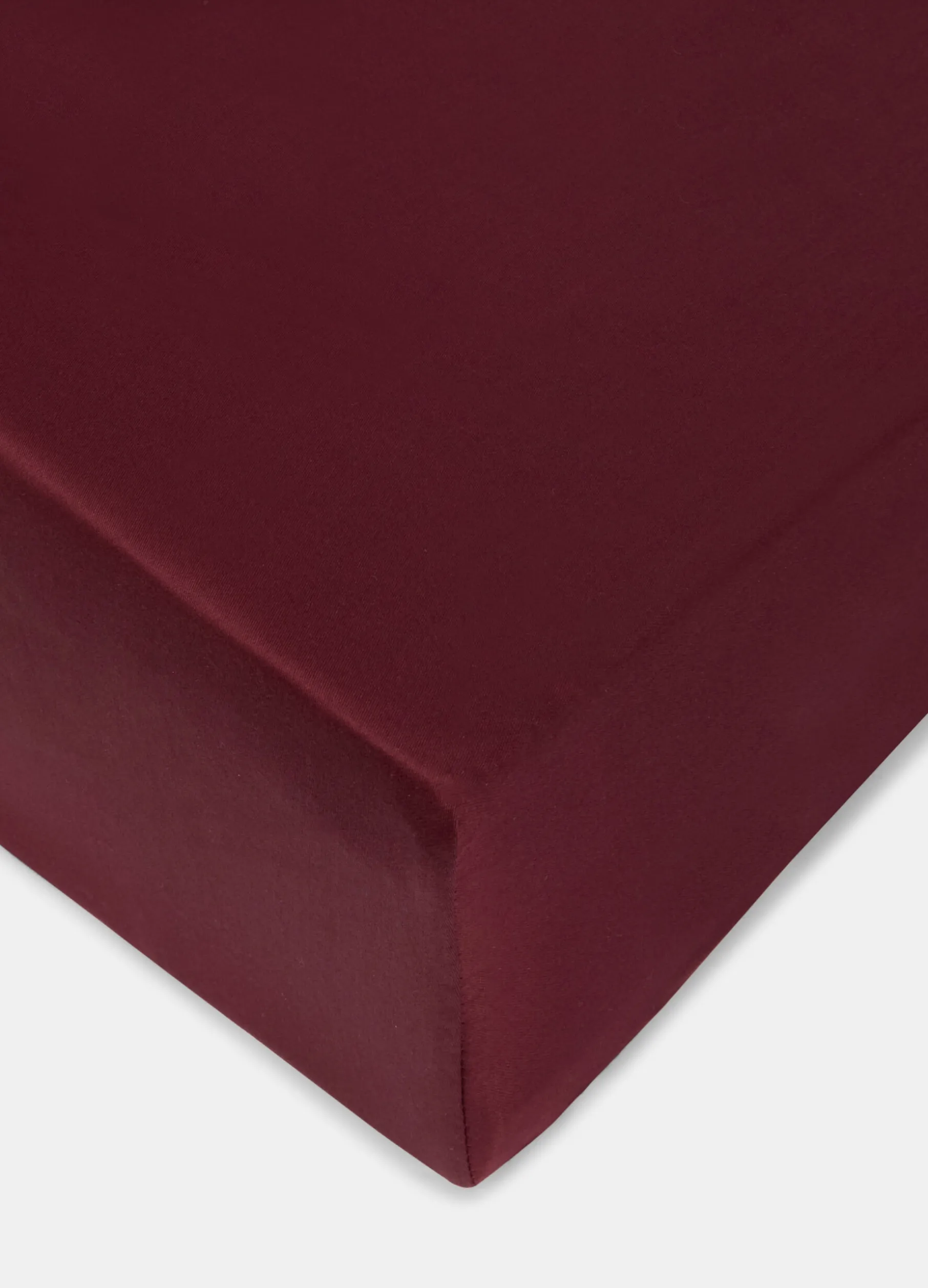 Lenzuolo con angoli a due piazze in tonalità rosso bordeaux realizzata in puro raso di cotone: la particolare tessitura del filato rende questo tessuto liscio e fresco al tatto, e luminoso, perfetto per garantire comfort e riposo per tutta la notte. Dimensioni: 200 x 175 x 30 cm.