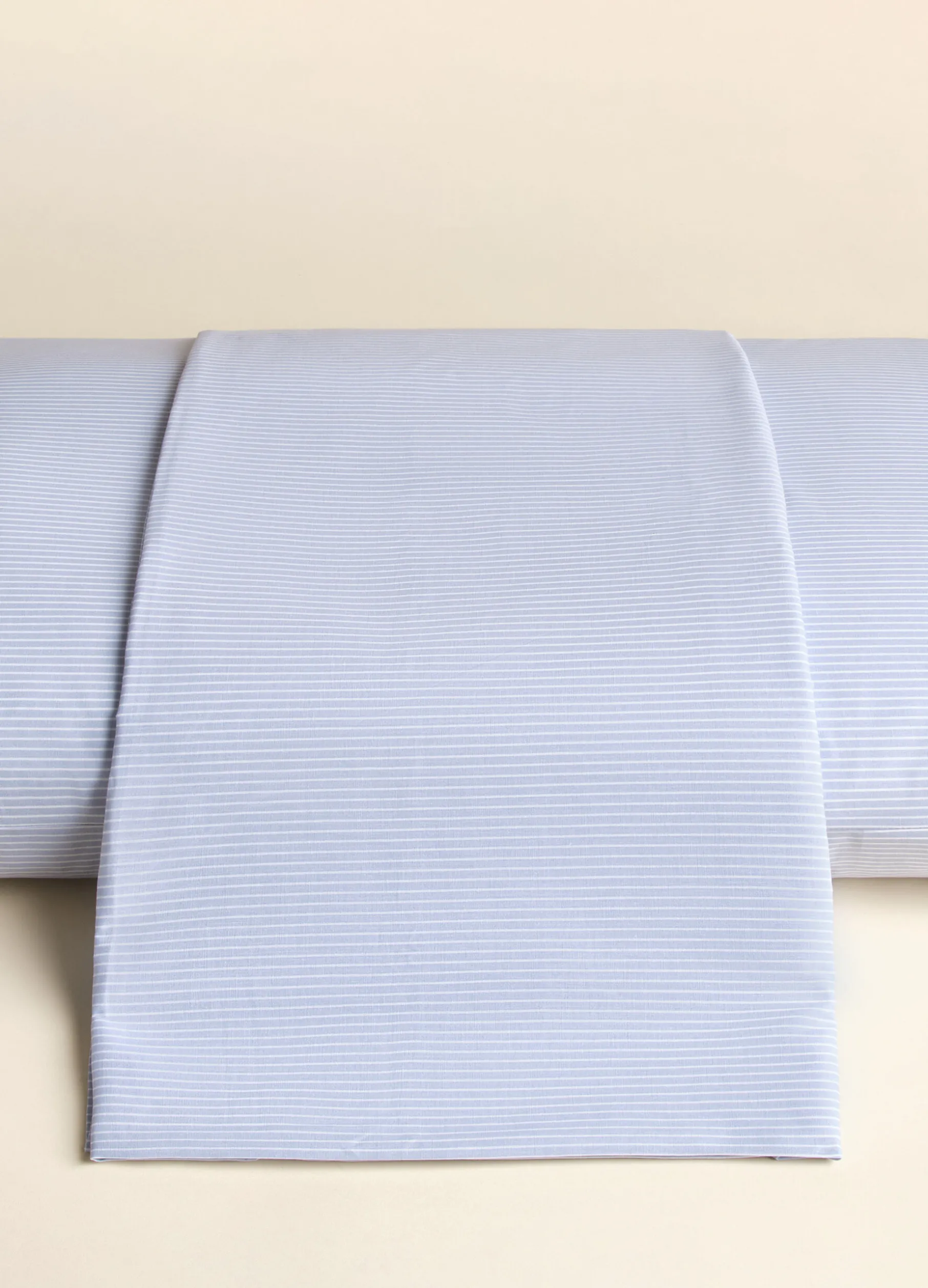 Lenzuolo in puro cotone per letto singolo arricchito da un motivo classico con righe bianche sottili sul fondo azzurro. Il filato di cotone è fresco e leggero, per garantire comfort e riposo ottimali.