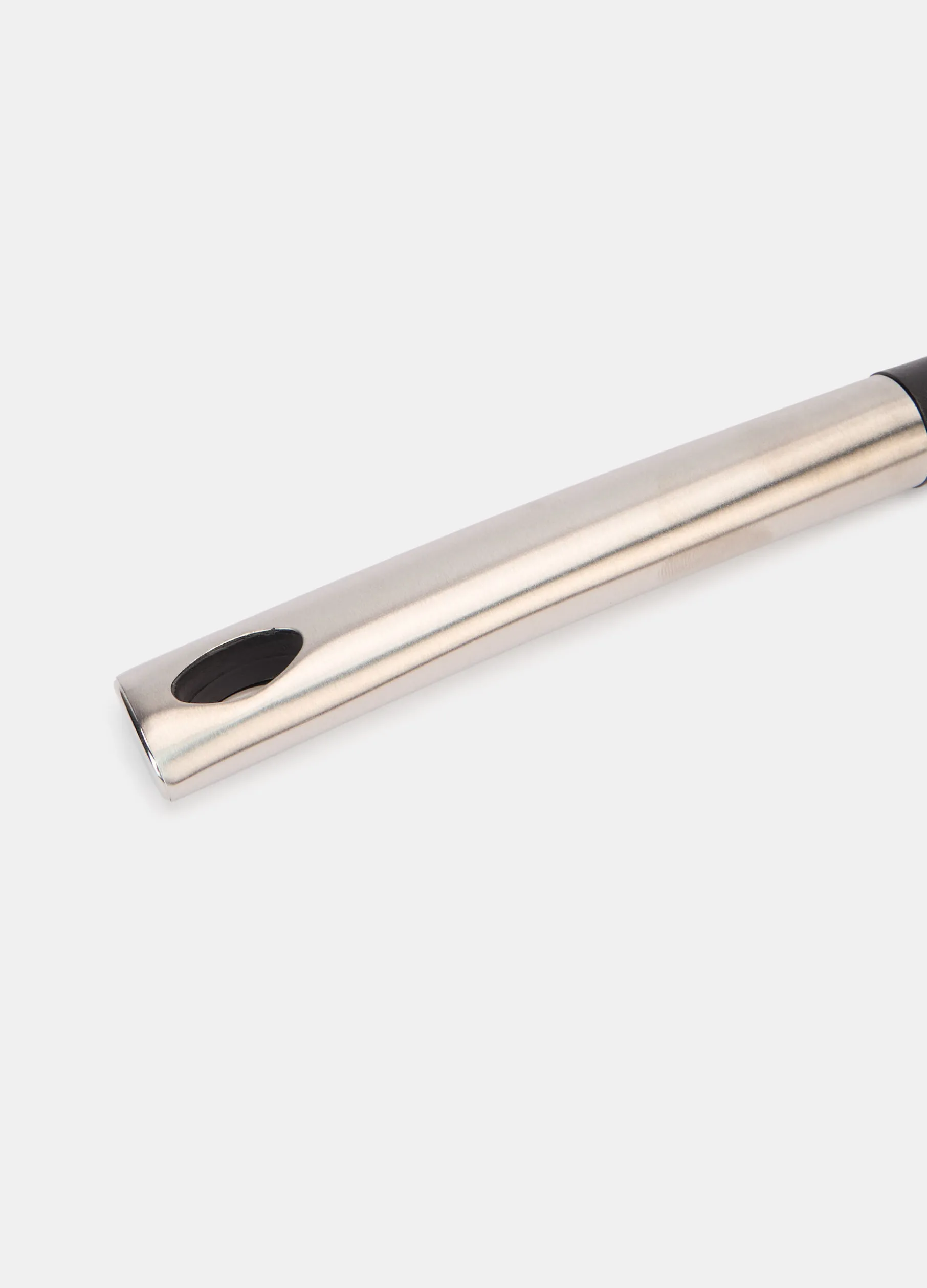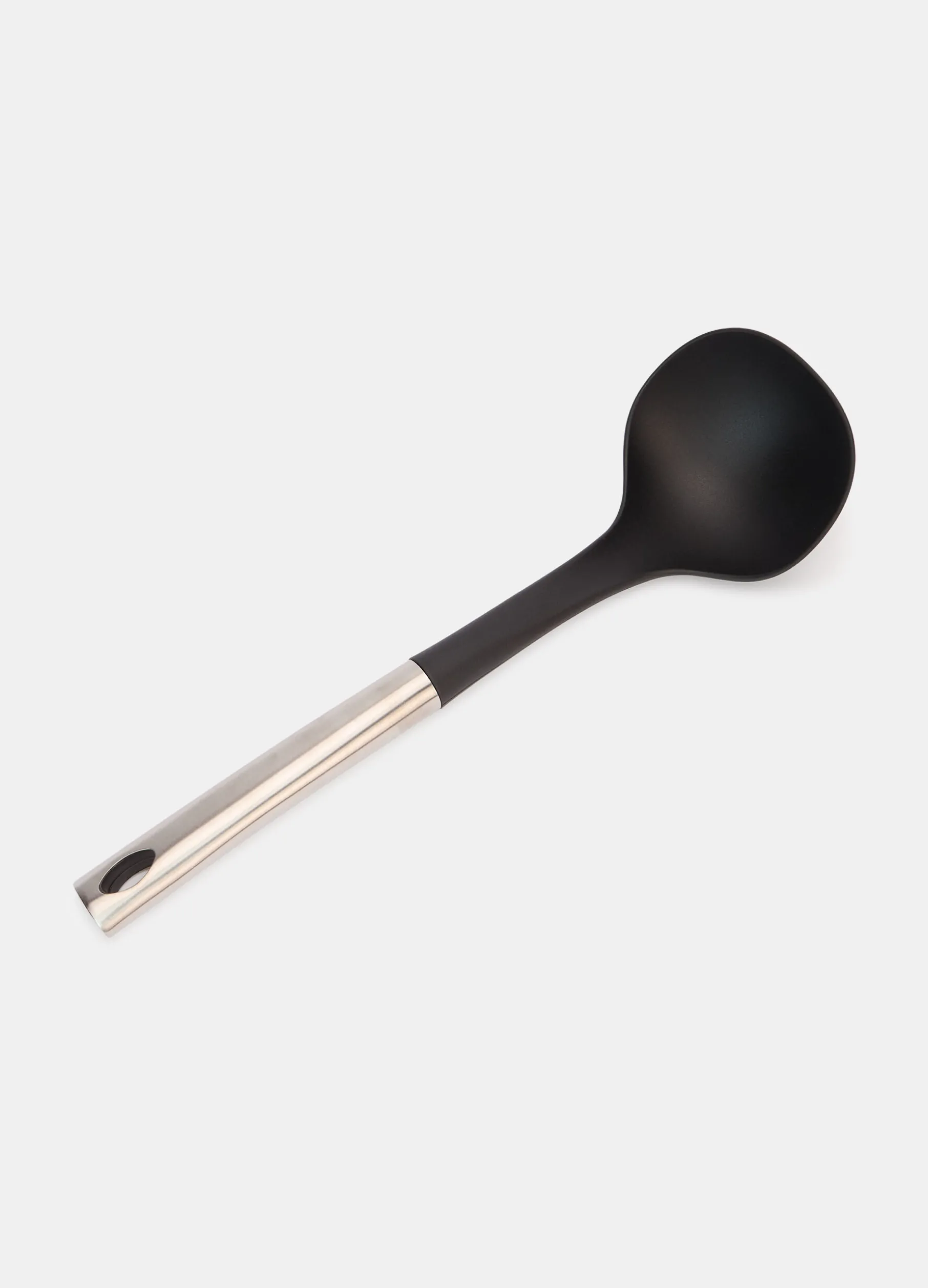 Pratico mestolo da cucina a forma di classico coppino, realizzato in poliammide nera, versatile e resistente. Con manico in metallo satinato e foro per appenderlo.