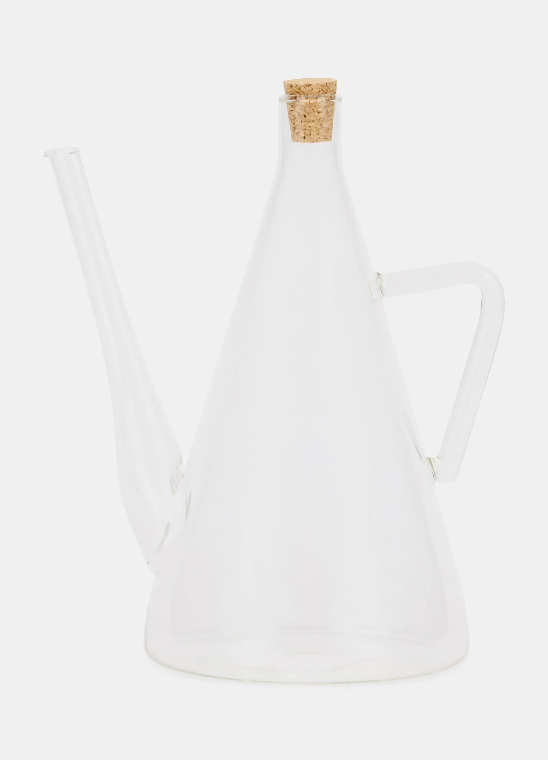 Oliera classica realizzata in vetro opaco e con una silhouette piramidale, completata dal beccuccio sottile e da un manico sporgente. Con tappo in sughero. Dimensioni: 10 x 19,5 cm.