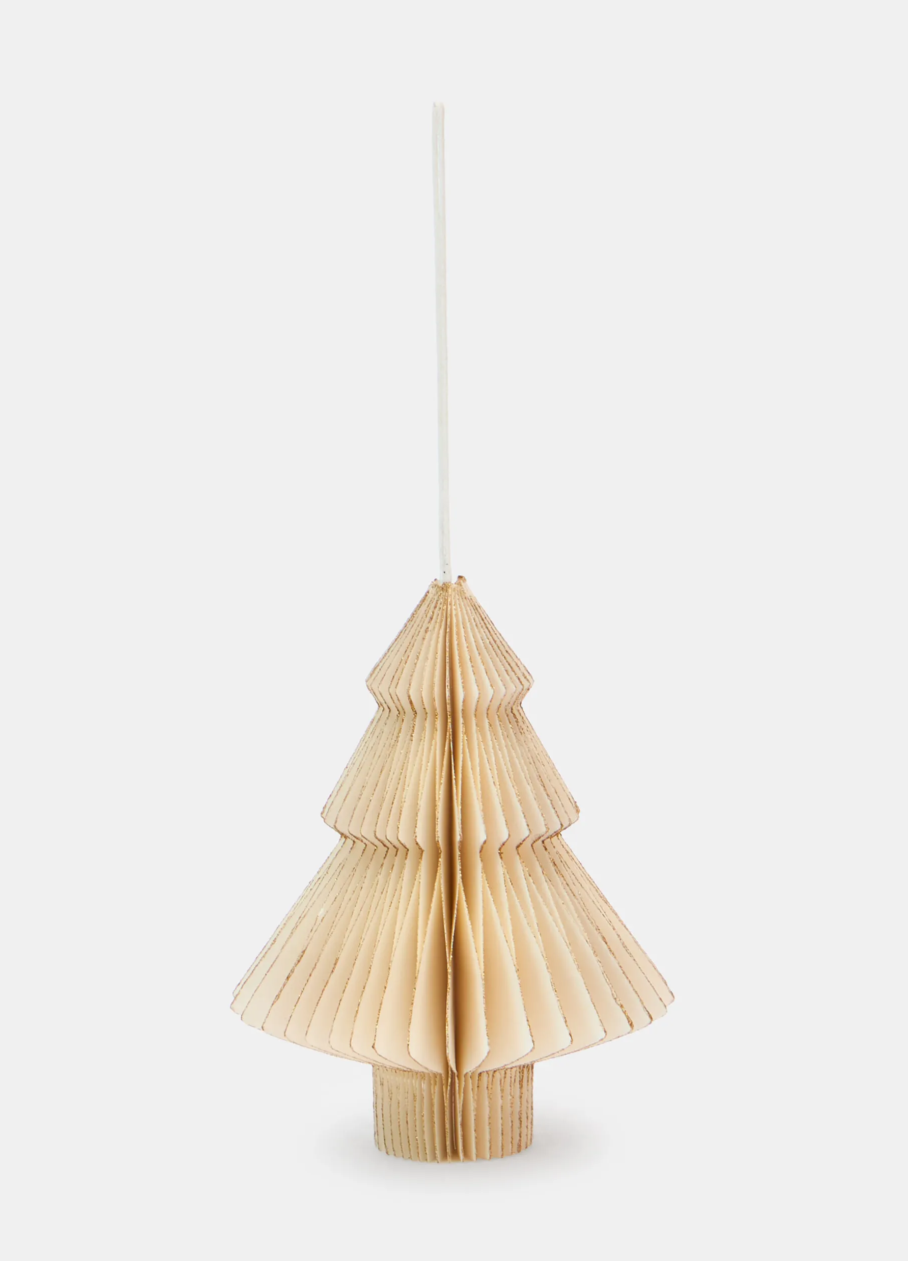 Delicato ornamento a forma di alberello da appendere all’albero di Natale o per rallegrare l’atmosfera domestica realizzato in carta giallo oro accuratamente tagliata e piegata e cosparsa di glitter. Completo di laccetto in tessuto abbinato. Altezza: 10 cm.