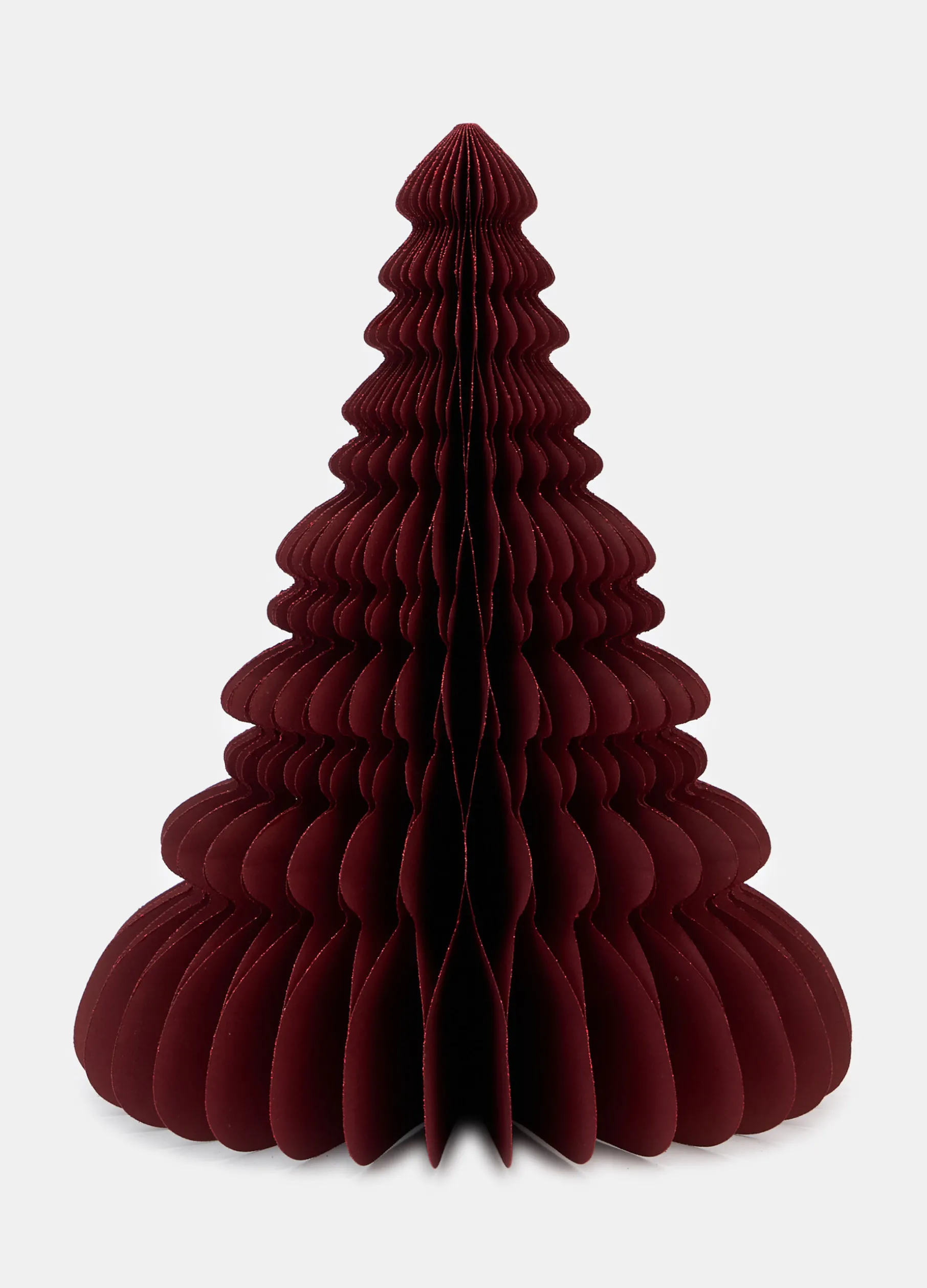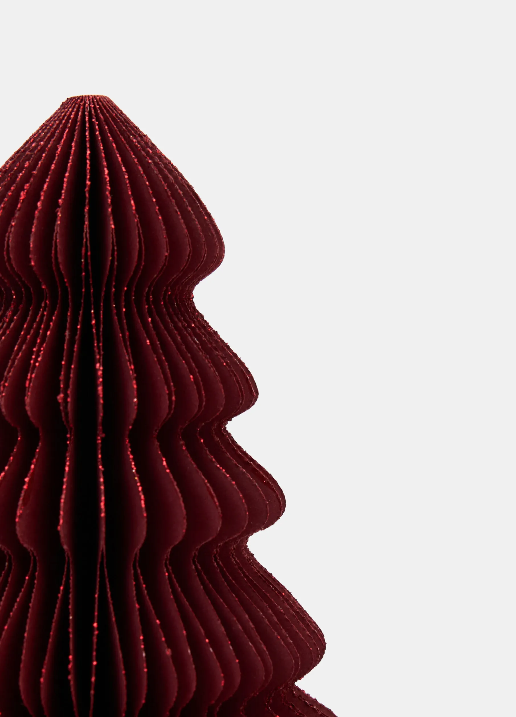 Alberello decorativo color bordeaux realizzato in carta spessa e consistente, piegata e ritagliata con cura per ricreare questo simbolo delle feste. Completato da una spolverata di glitter in tono. Altezza: 30 cm.