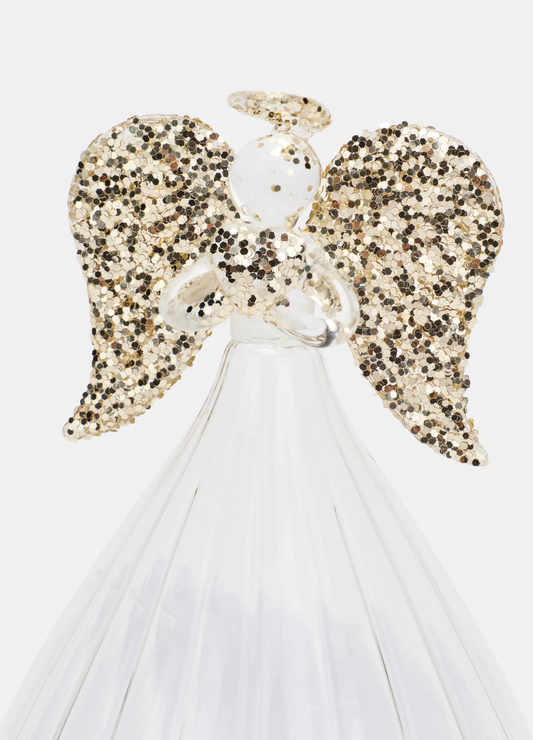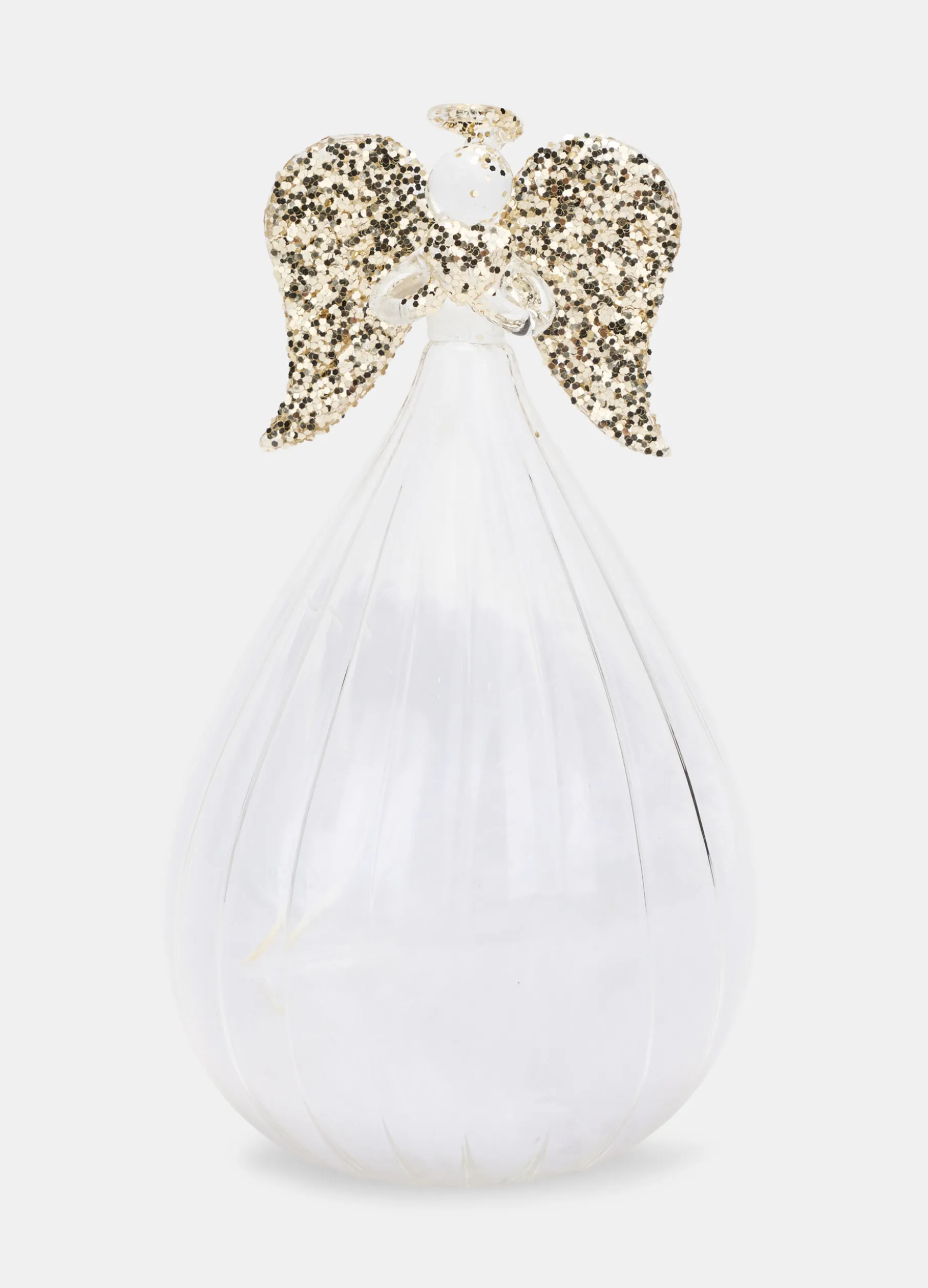 Delicato ornamento natalizio in vetro soffiato trasparente a forma di angioletto, con aureola e ali ricoperte da paillette dorate. Completo di cordino per appenderlo all’albero di Natale, alle maniglie o ai pomelli. Altezza: 16 cm; diametro: 9,6 cm.