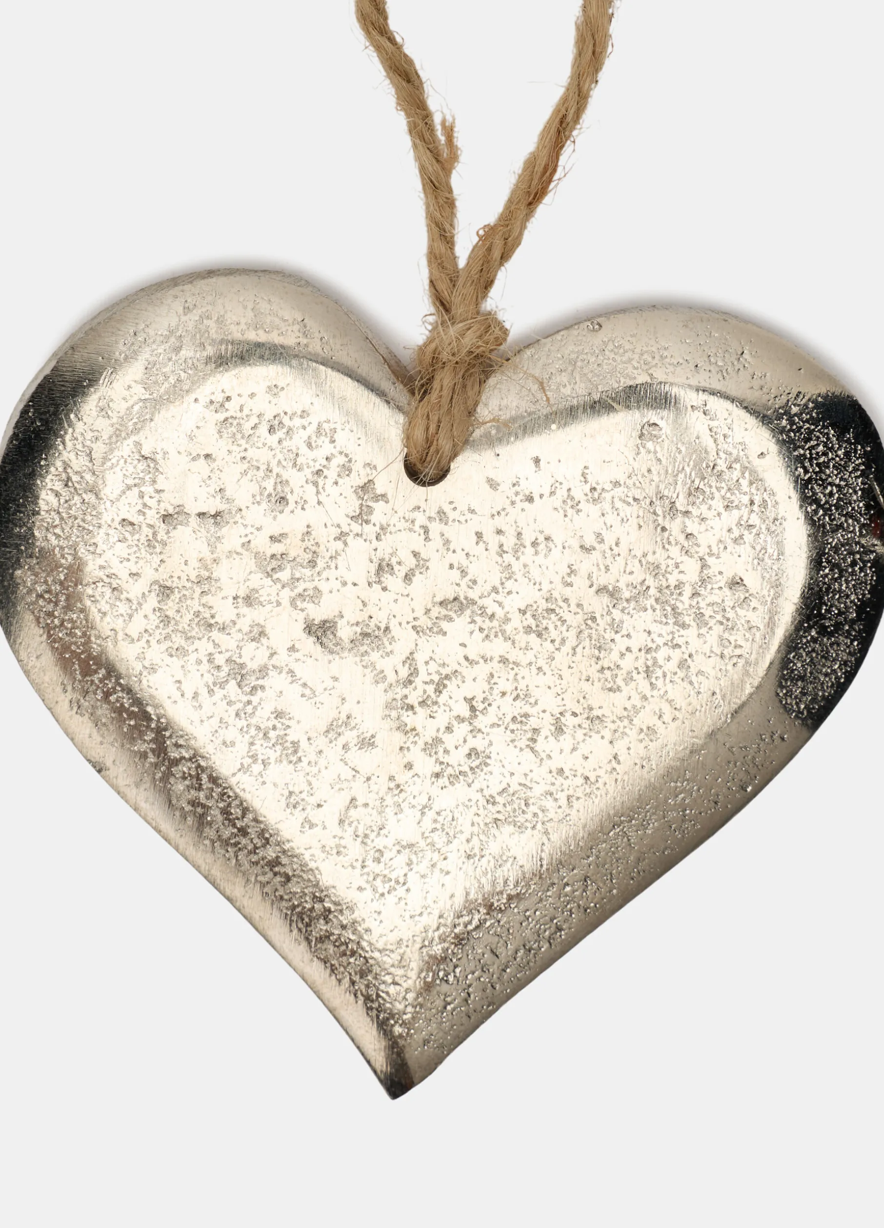 Delicato ornamento a forma di cuore da appendere all’albero di Natale, ma non solo, realizzato in alluminio con finitura argentata e un particolare effetto anticato. Dimensioni: 7,5 x 7 x 1 cm.