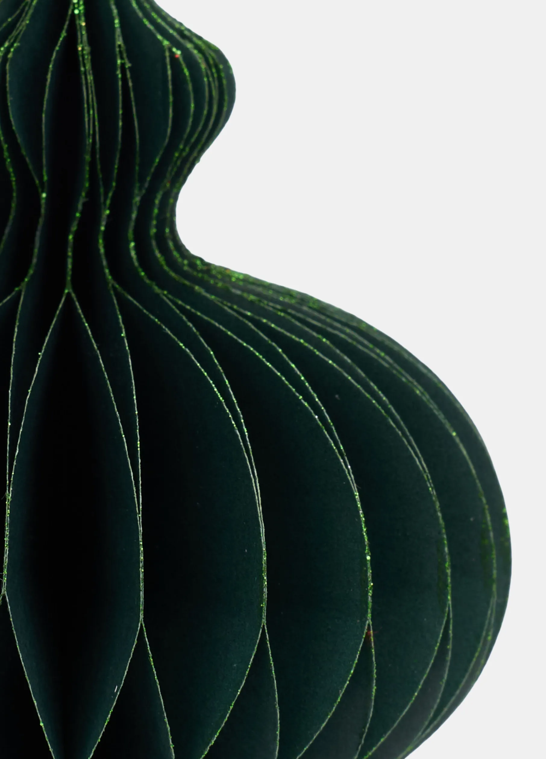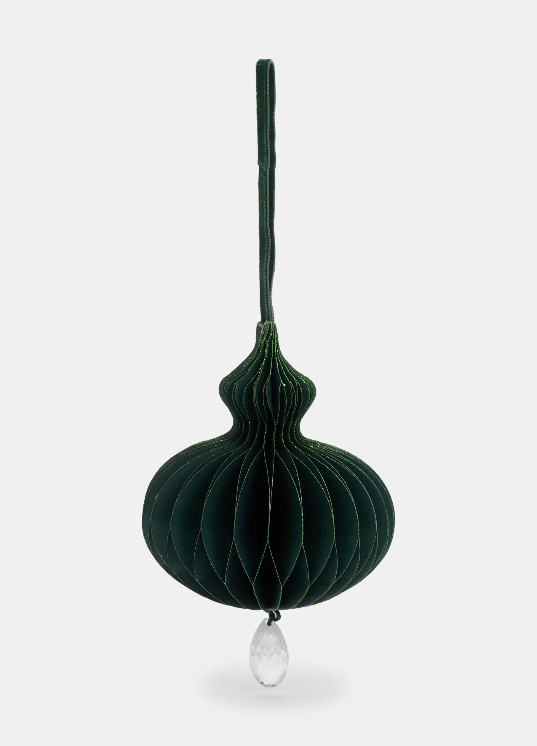 Delicato ornamento a forma di pallina da appendere all’albero di Natale o per rallegrare l’atmosfera domestica realizzato in carta giallo oro accuratamente tagliata e piegata e cosparsa di glitter. Completo di laccetto in tessuto e perlina di vetro sul fondo. Altezza: 10 cm.