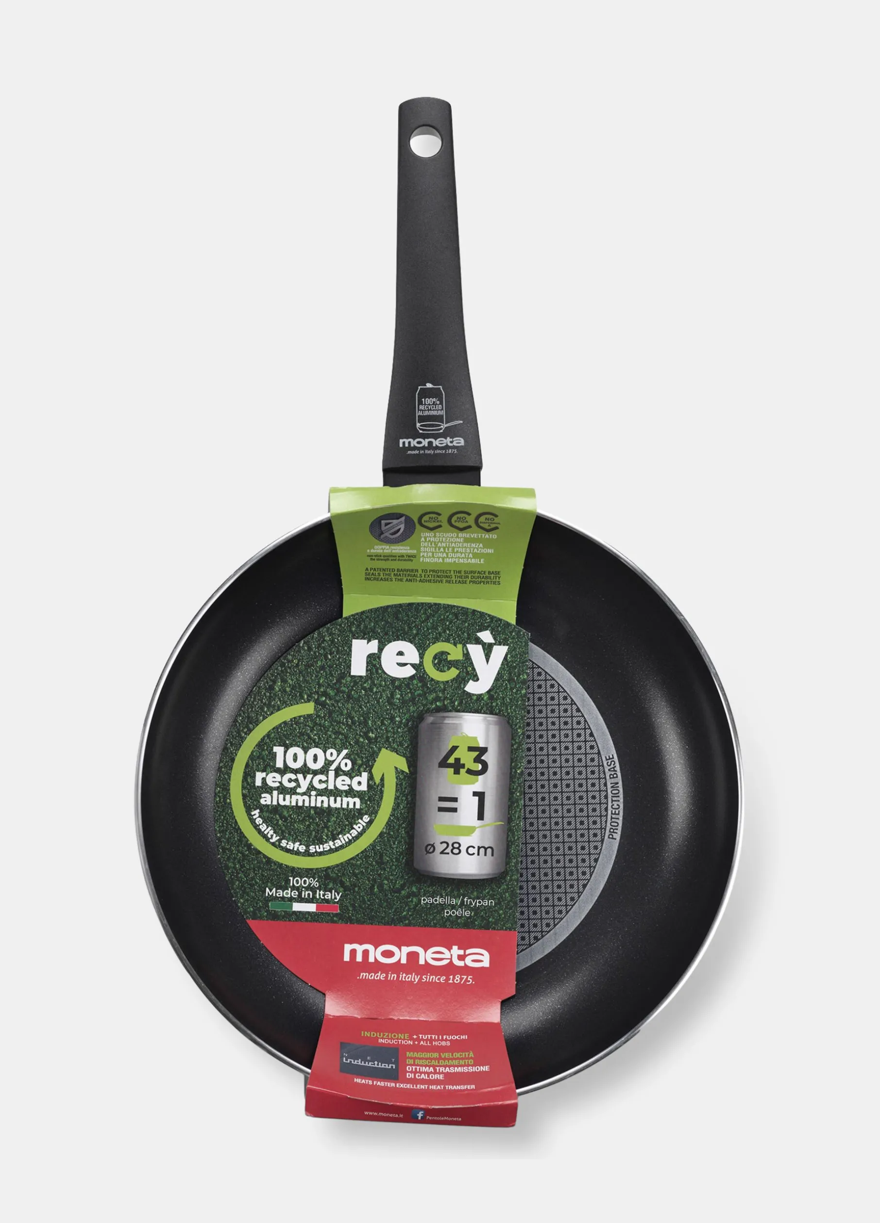 Padella Recy con corpo in alluminio 100% riciclato, ideale per tutti i piani cottura compreso quello ad induzione. Dimensioni 37×7.5×20.5 cm. Made in Italy.
