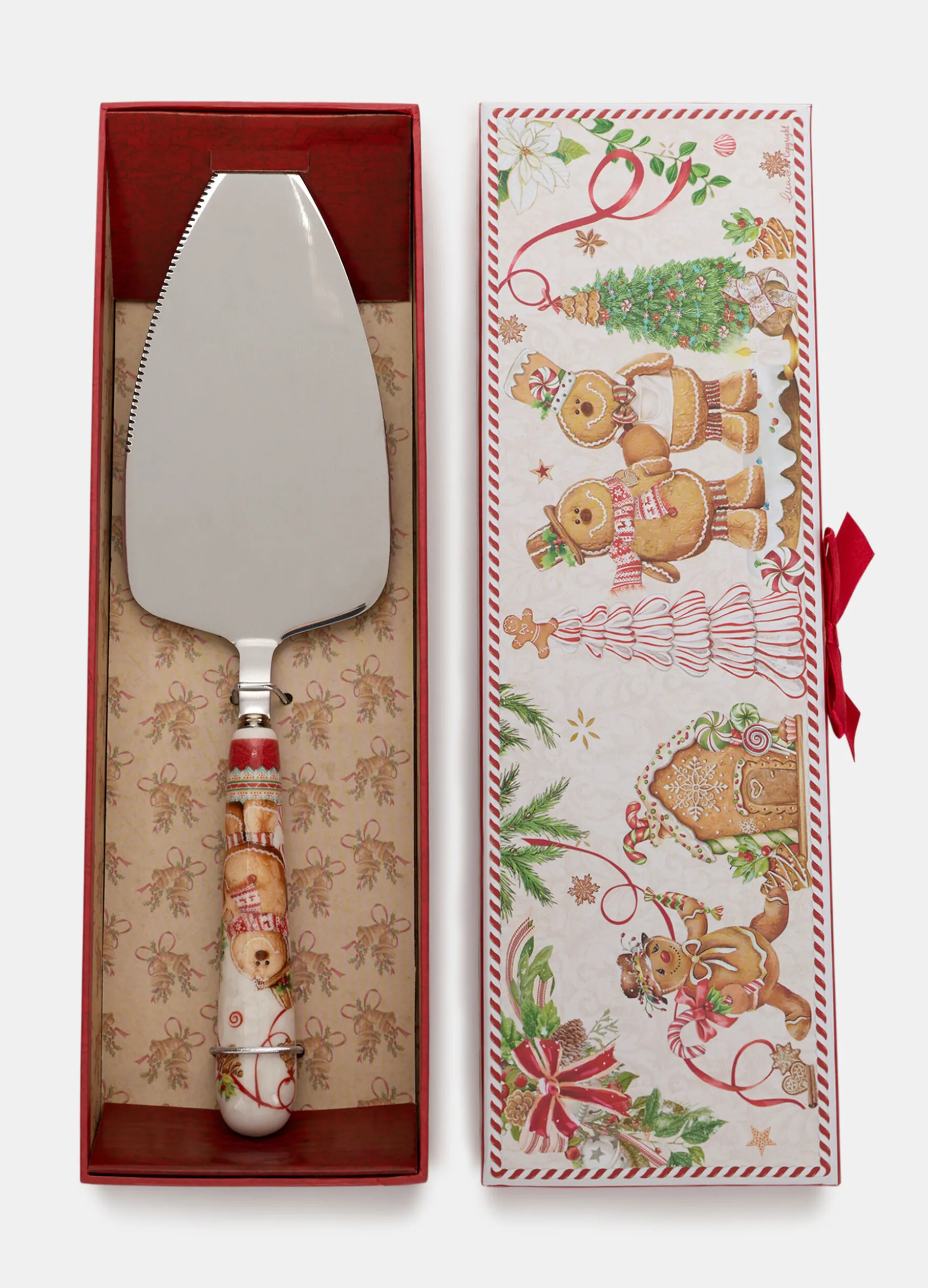 Paletta per torta in metallo lucido con lama incorporata, completato dal manico in porcellana e dalla confezione regalo abbinata in cartone. La decorazione con omini di pan di zenzero e ghirlande richiama un’atmosfera invernale e festiva. Dimensioni: 3,8 x 27,8 cm.