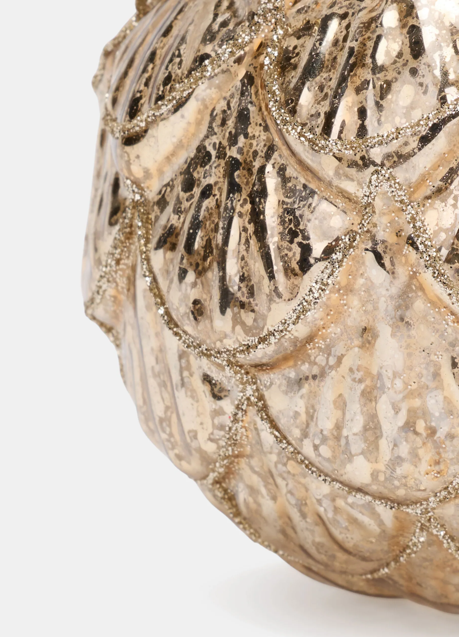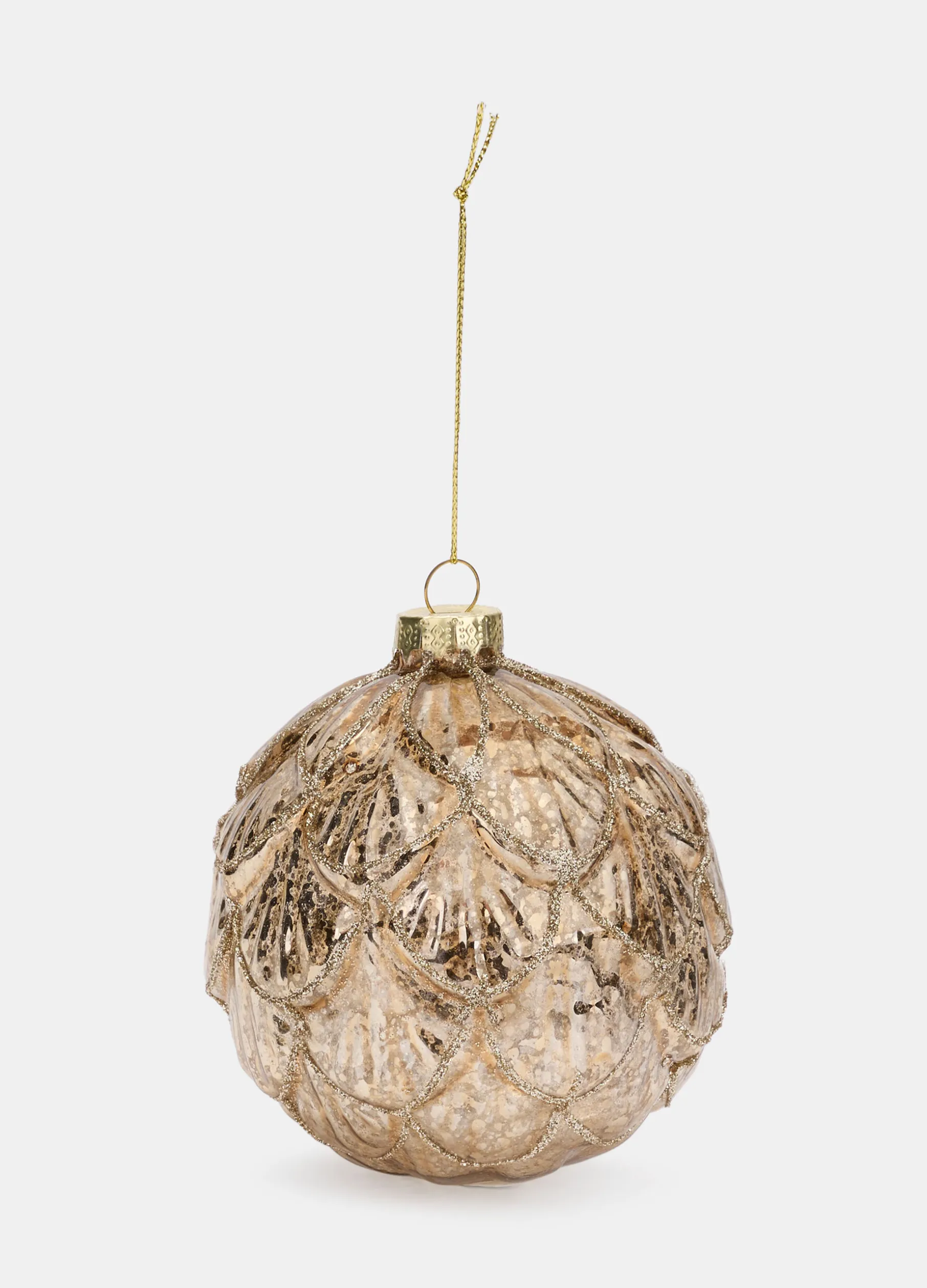 Elegante pallina decorativa in vetro dipinto con tinte seppia e trattato per ottenere un effetto anticato. La superficie a scaglie è arricchita da profili glitterati. Completata dal cordino per appenderla all’albero di Natale. Diametro: 10 cm.