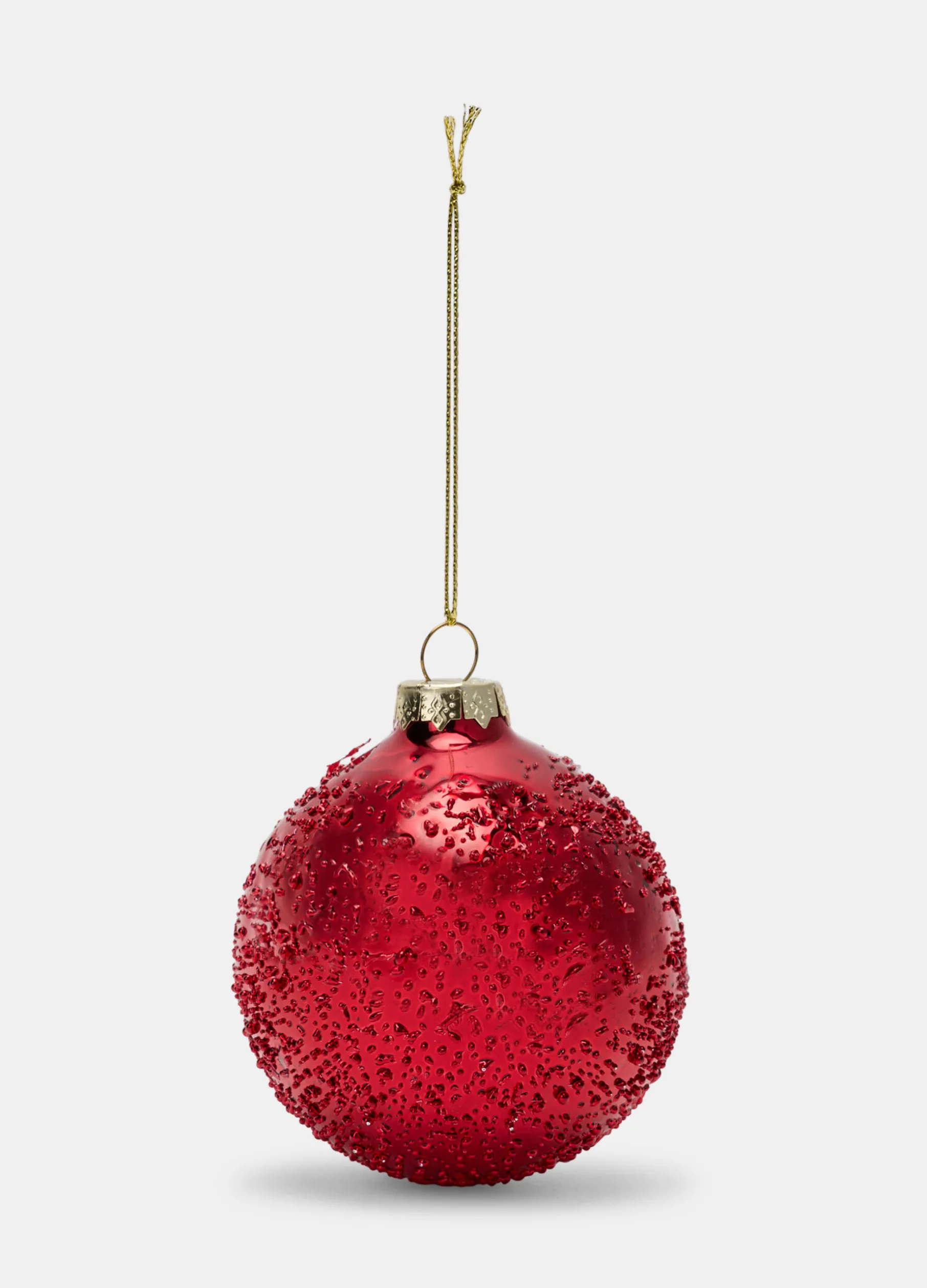 Pallina decorativa in vetro rosso lucido, arricchito una particolare texture simile a goccioline che ricrea sulla superficie un effetto bagnato. Completa di cordino per appenderla all’albero di Natale. Diametro: 8 cm.