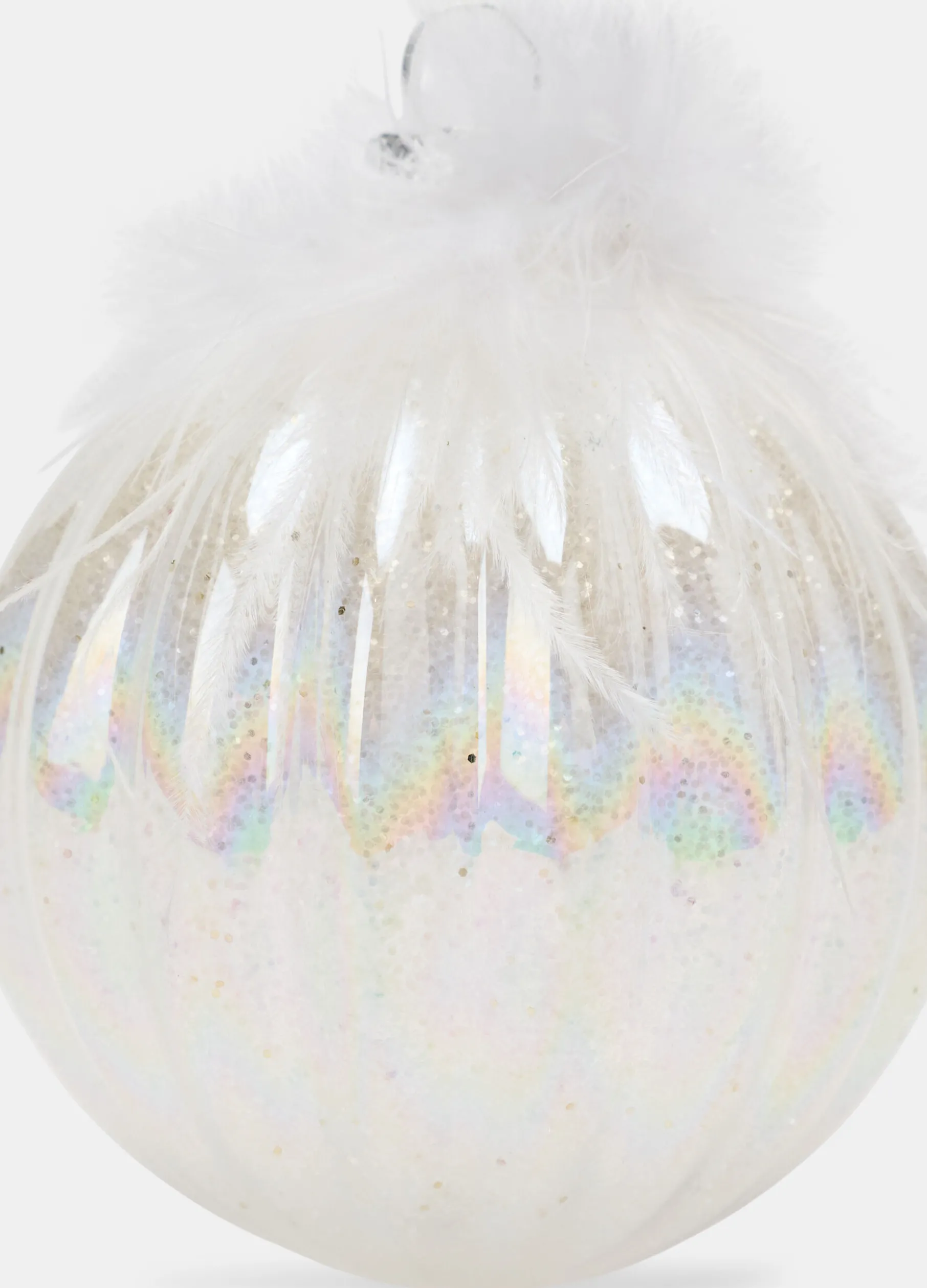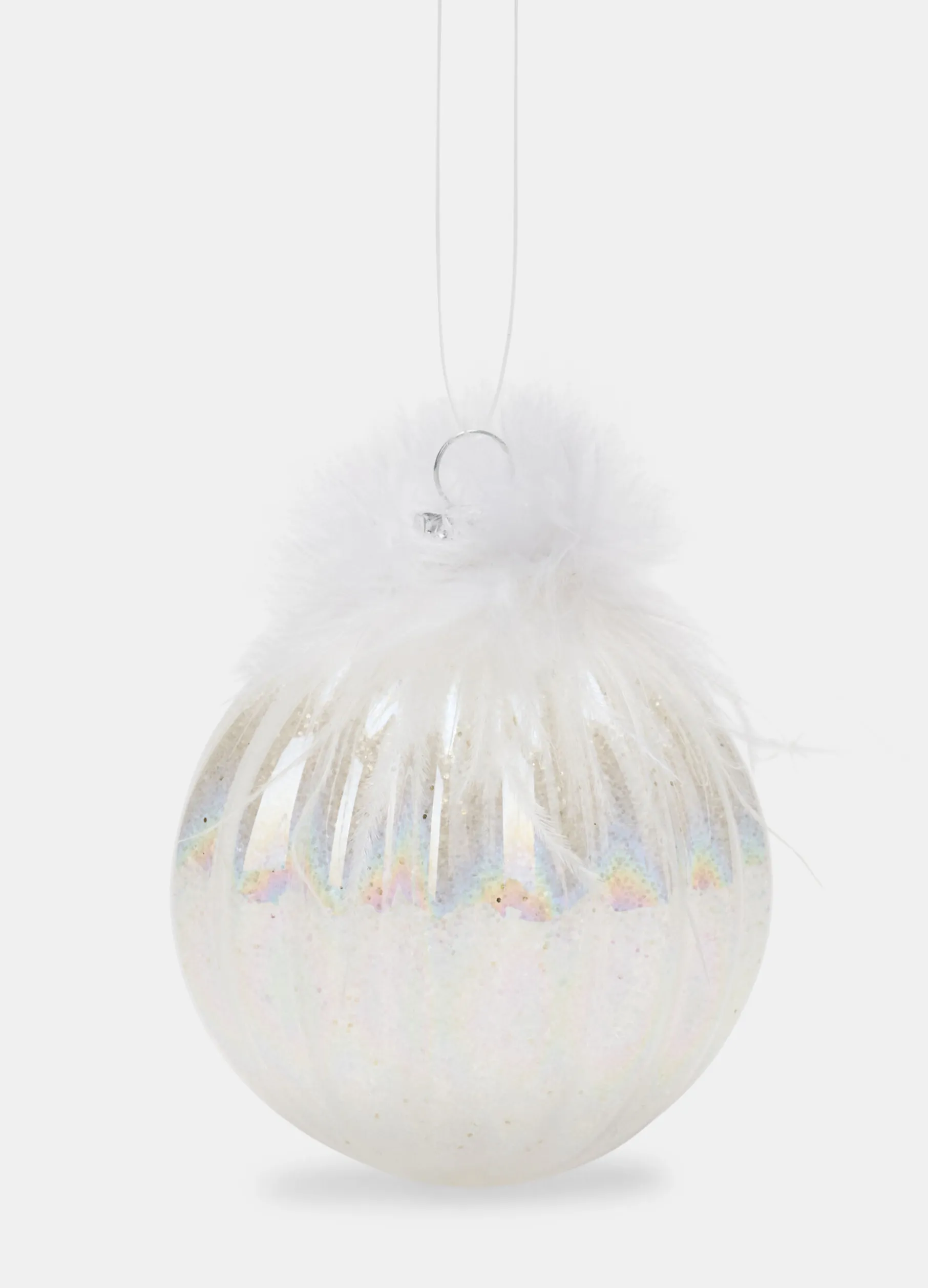 Pallina decorativa bianco e argento realizzata in vetro scanalato, satinato e trattato per ottenere un particolare effetto lucido e luminoso simile alla neve. Completata da inserto in piume e cordino per appenderla all’albero di Natale. Diametro: 8 cm.