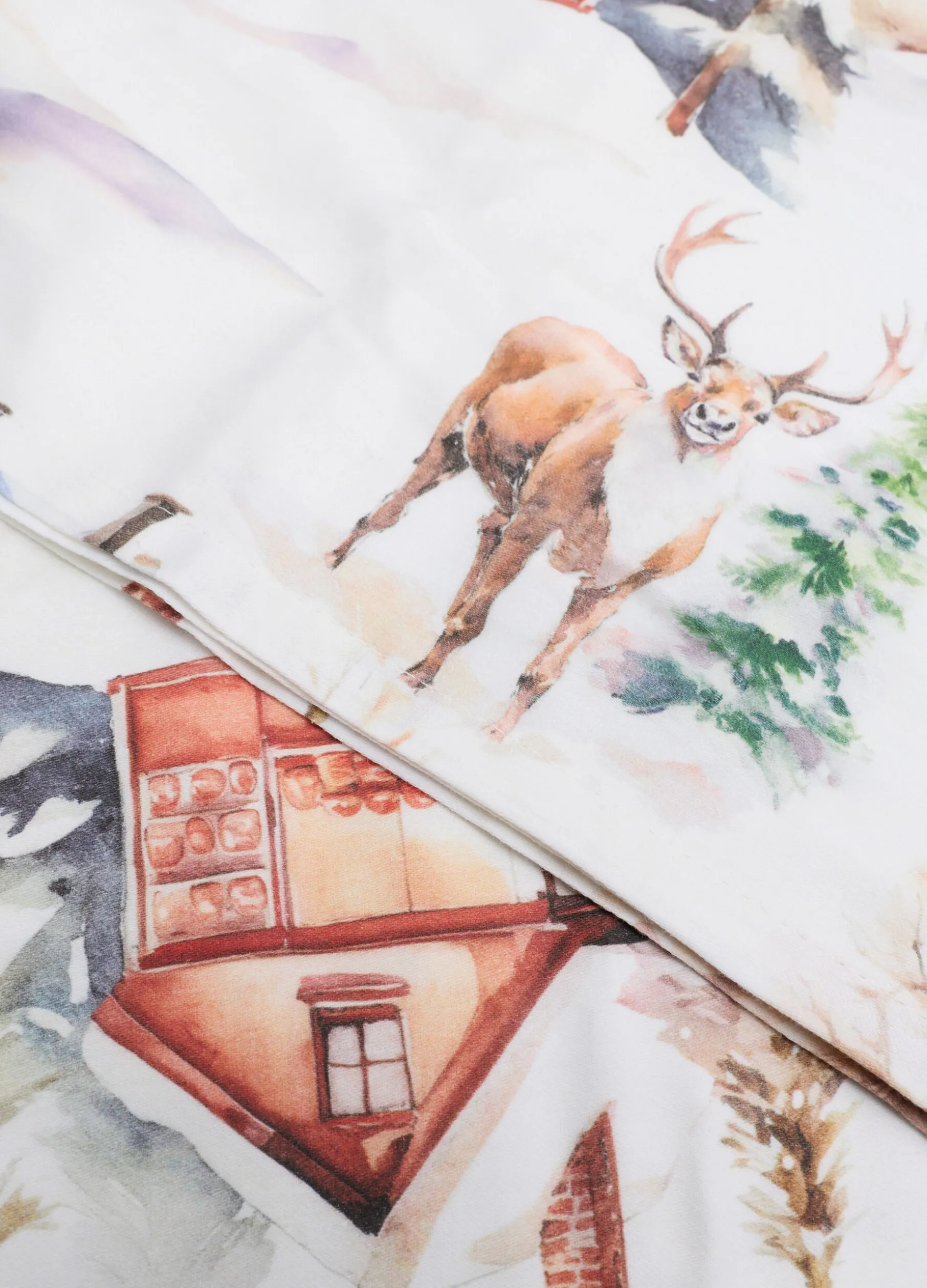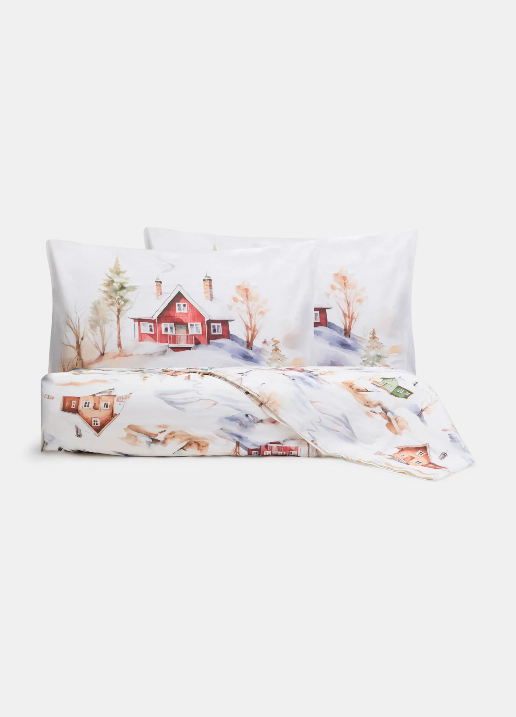 Set di copripiumino e federe realizzati al 100% in raso di cotone bianco candido, leggero e fresco per garantire un riposo ottimale durante tutta la notte. Il tessuto è arricchito da una stampa digitale ispirata all’atmosfera delle feste. Composta da copripiumino 200 x 250 cm e due federe 50 x 80 cm.