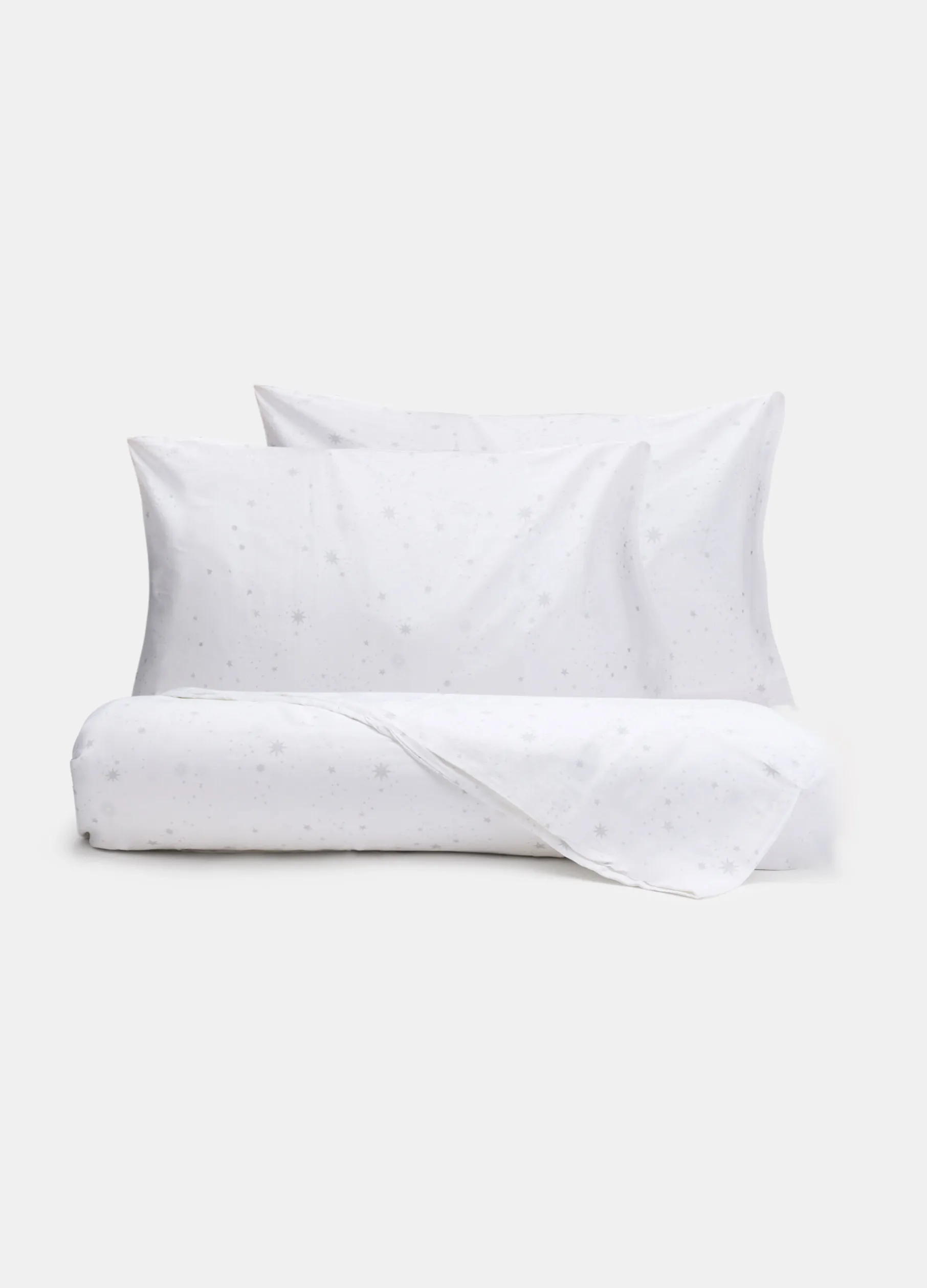 Set di copripiumino e federe realizzati al 100% in raso di cotone bianco candido, leggero e fresco per garantire un riposo ottimale durante tutta la notte. Il tessuto è arricchito da una discreta stampa digitale all-over con stelline e fiocchi di neve, che richiama un’atmosfera festosa e invernale. Composta da copripiumino 200 x 250 cm e due federe 50 x 80 cm.