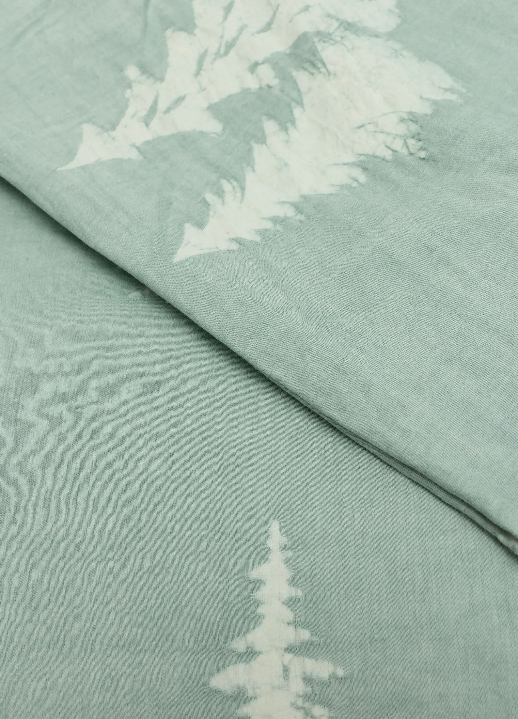 Parure per letto matrimoniale a due piazze che include copripiumino e federe, realizzata in cotone lavato: il trattamento particolare rende più sfumata e “vissuta” la tonalità di verde, su cui risalta la particolare stampa con abeti effetto bleached. Composta da copripiumino 220 x 250 cm e due federe 50 x 80 cm.