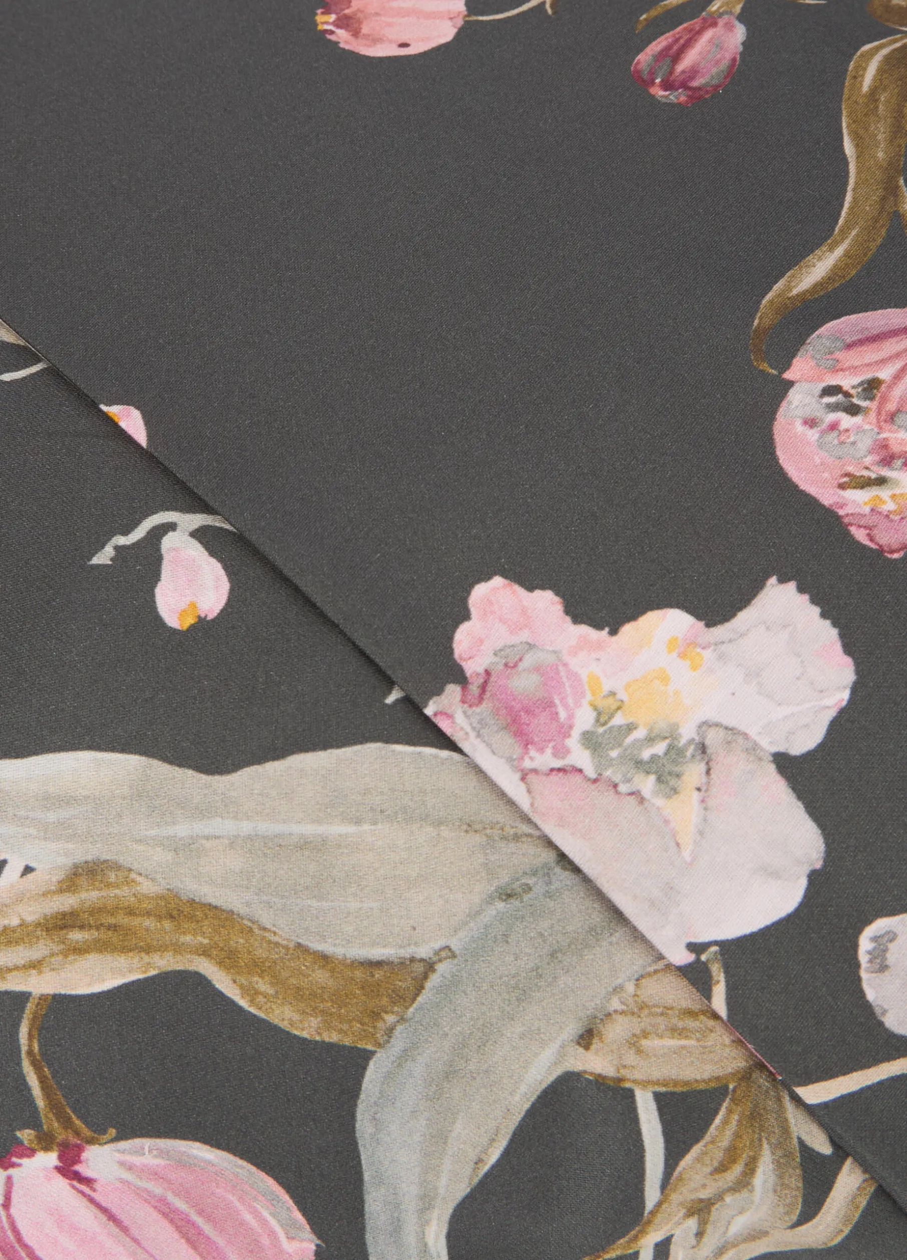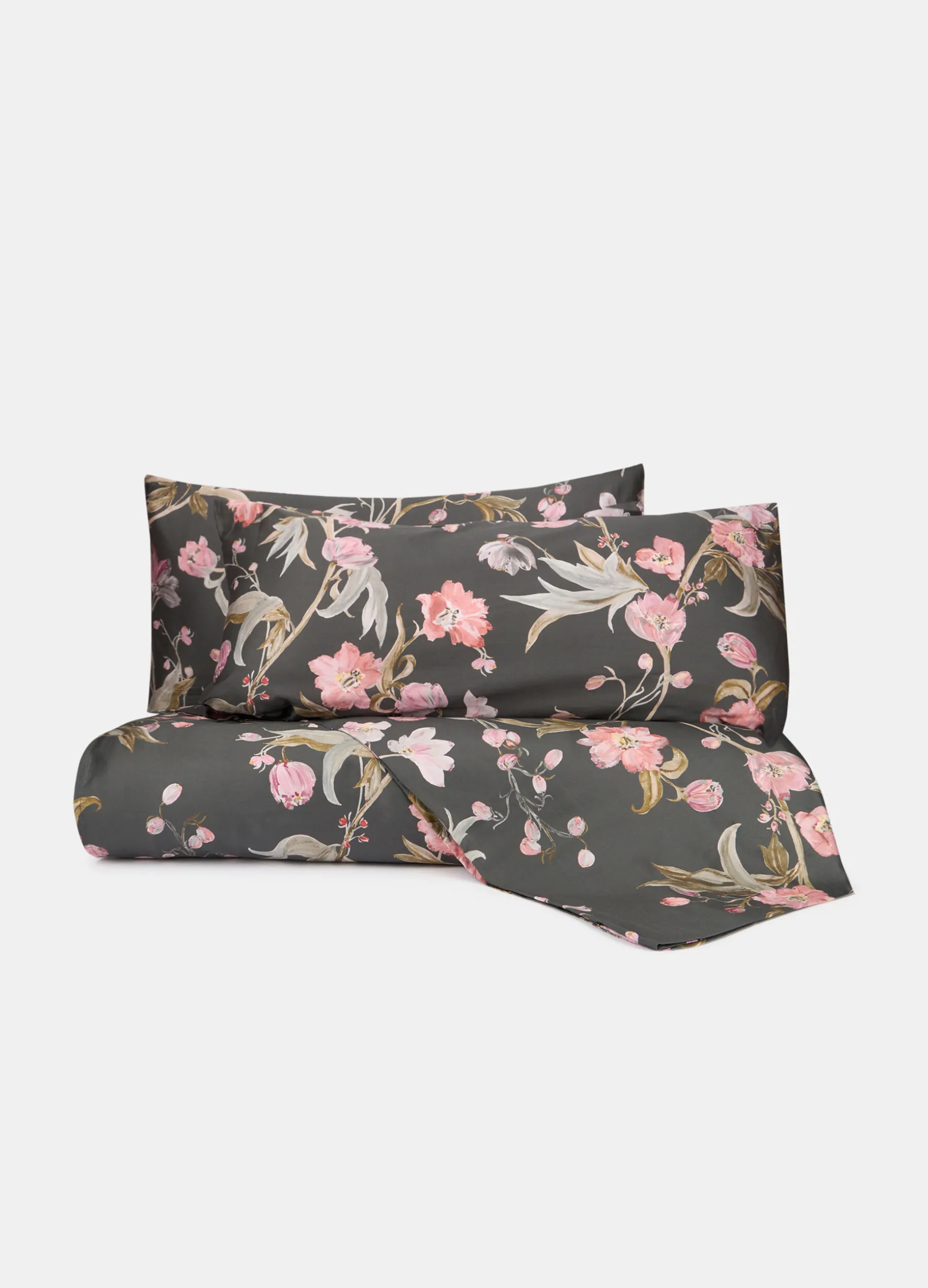 Parure abbinata con copripiumino caratterizzata dal motivo a fiori chiari sullo sfondo nero in raso di cotone. La particolare tessitura del filato rende questo tessuto liscio e fresco al tatto, e luminoso, perfetto per garantire comfort e riposo. Composta da copripiumino 250 x 200 cm e due federe 50 x 80 cm.