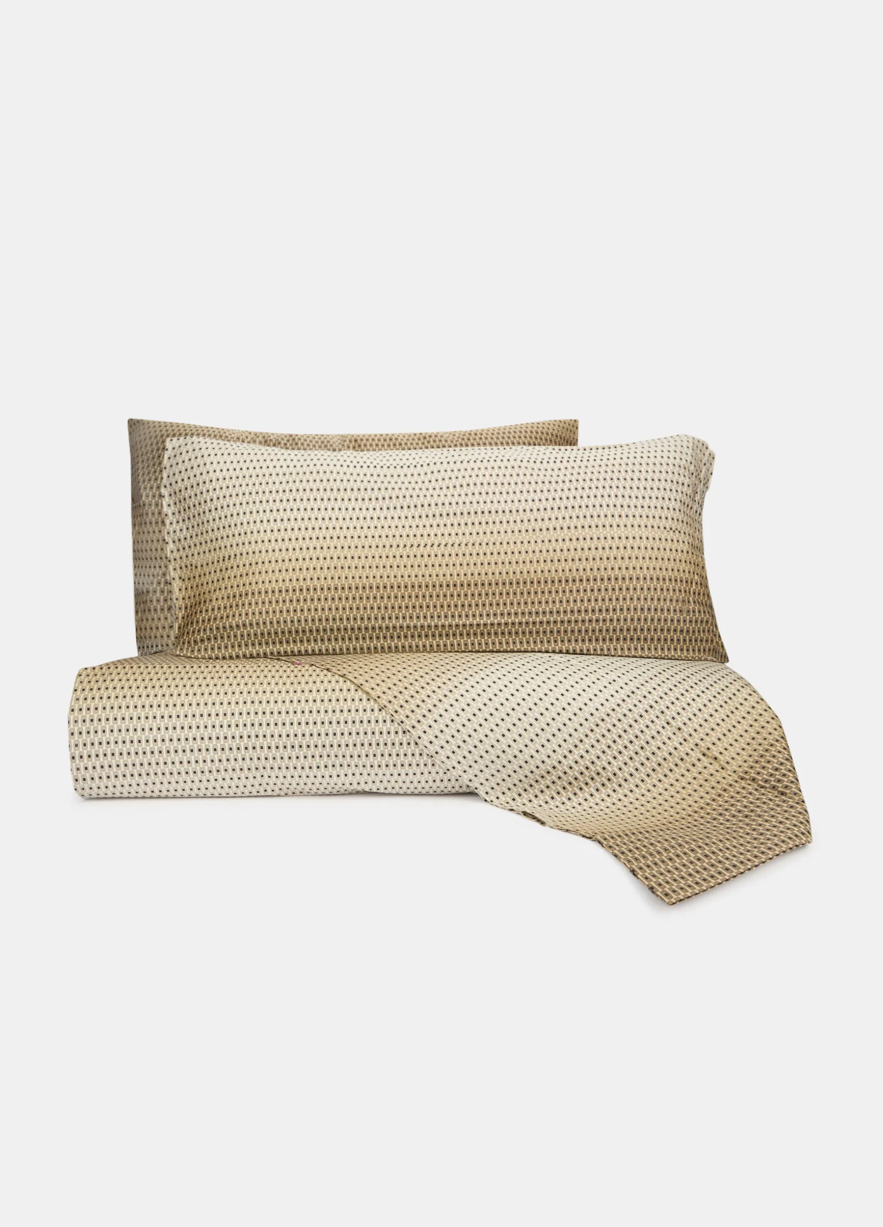 Parure coordinata con federe e lenzuolo a due piazze in puro raso di cotone: grazie alla particolare lavorazione, il tessuto appare liscio e luminoso, perfetto per garantire il riposo e accentuare il motivo a contrasto di ispirazione vintage. Composta da lenzuolo 280 x 240 cm e due federe 50 x 80 cm.