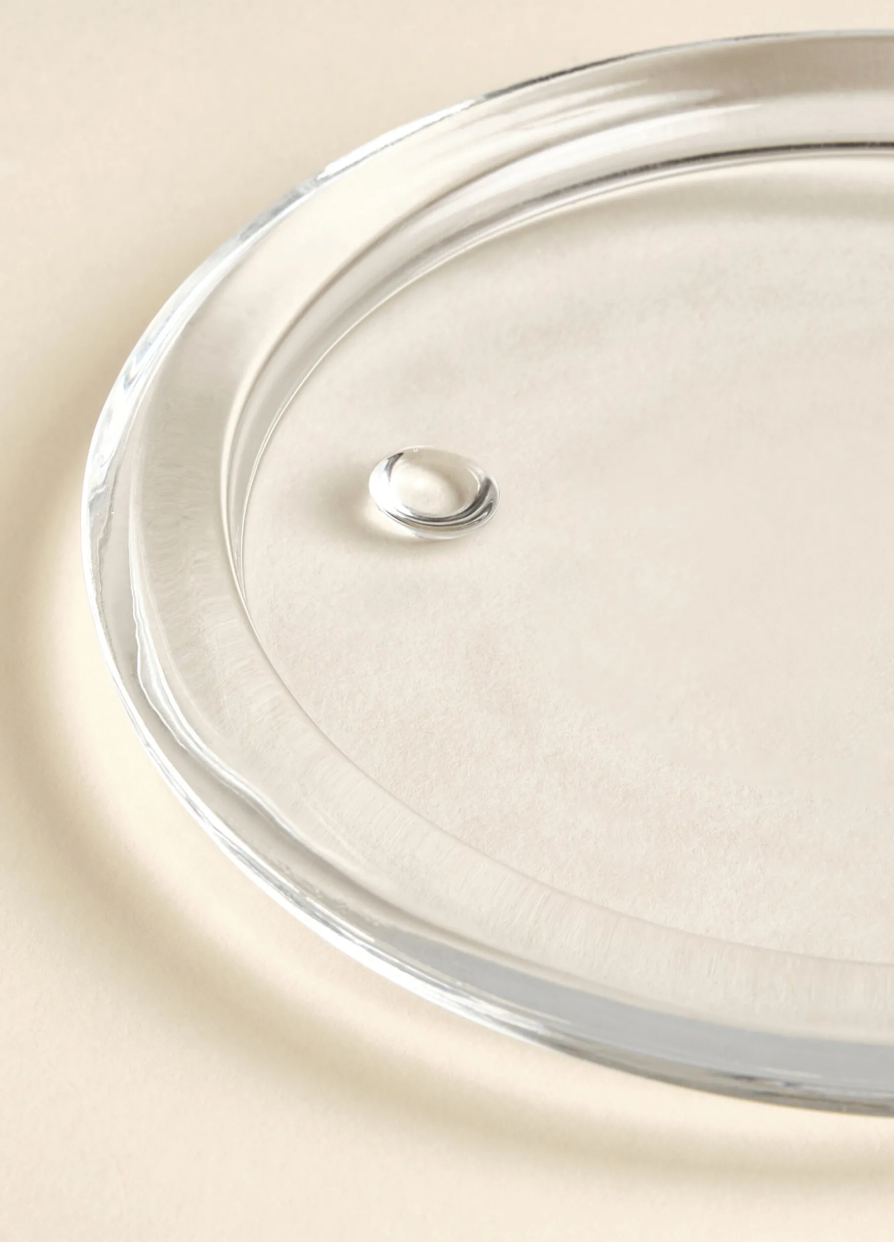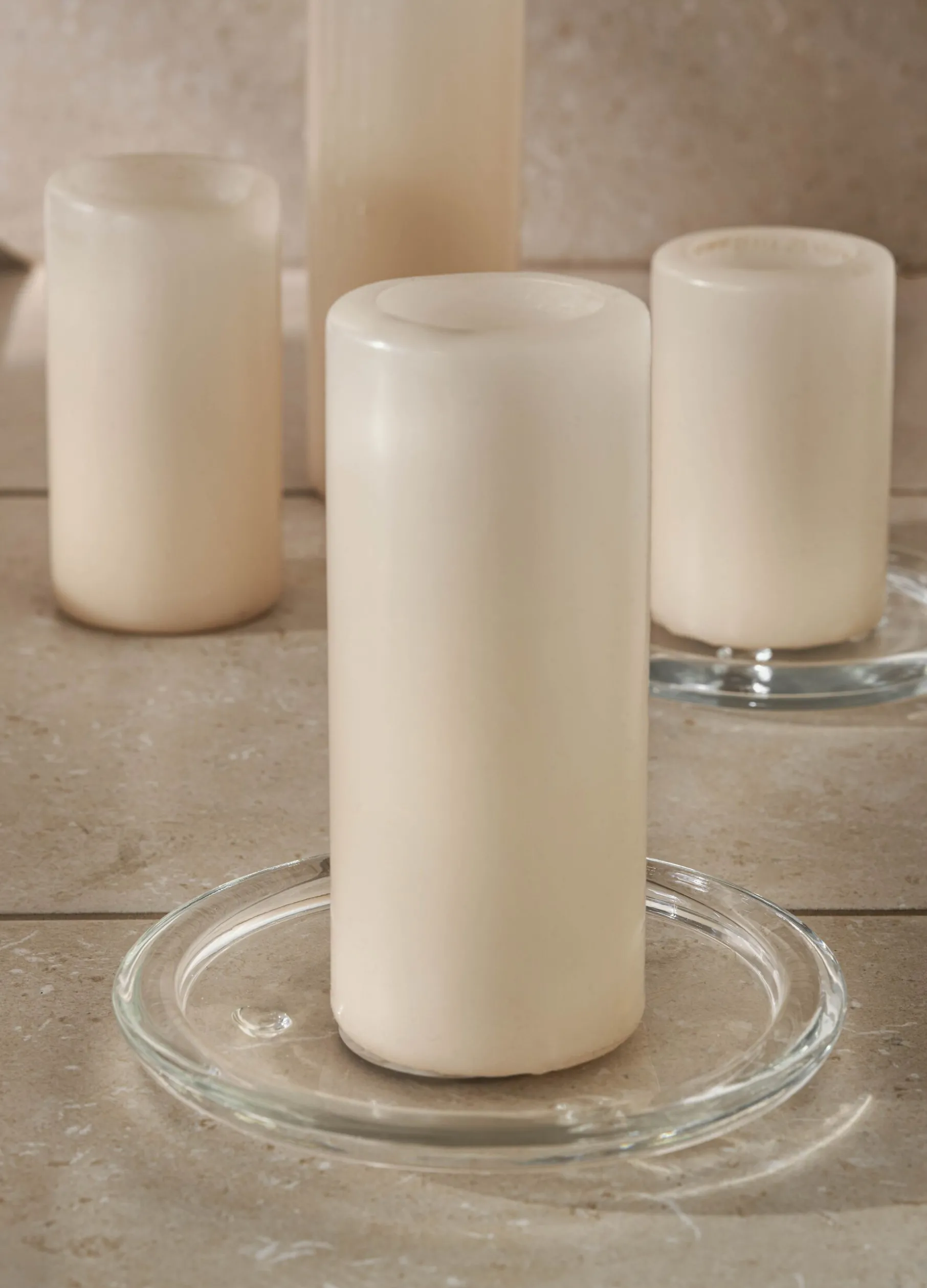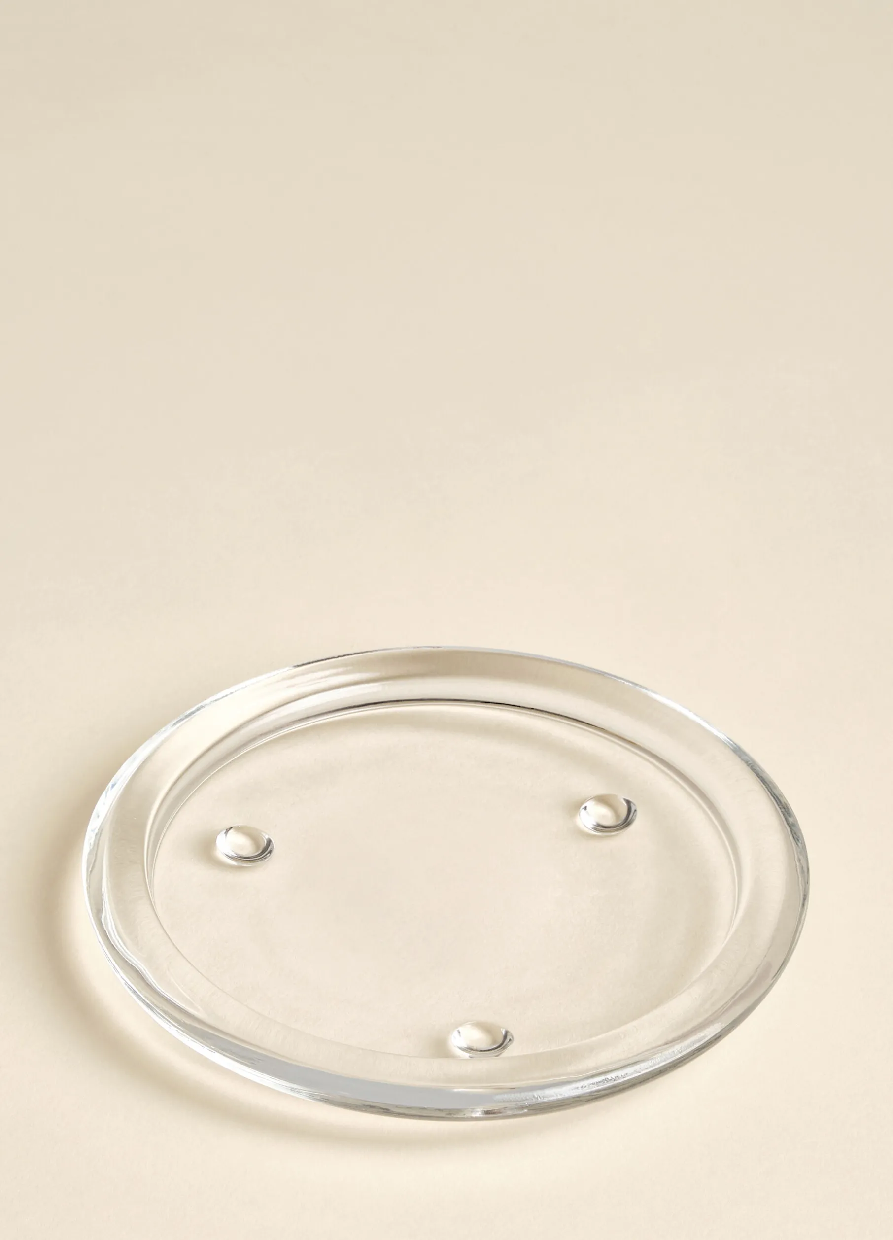 Piattino portacandele in vetro trasparente dai bordi smussati e arrotondati, completo di piedini di supporto sul fondo.