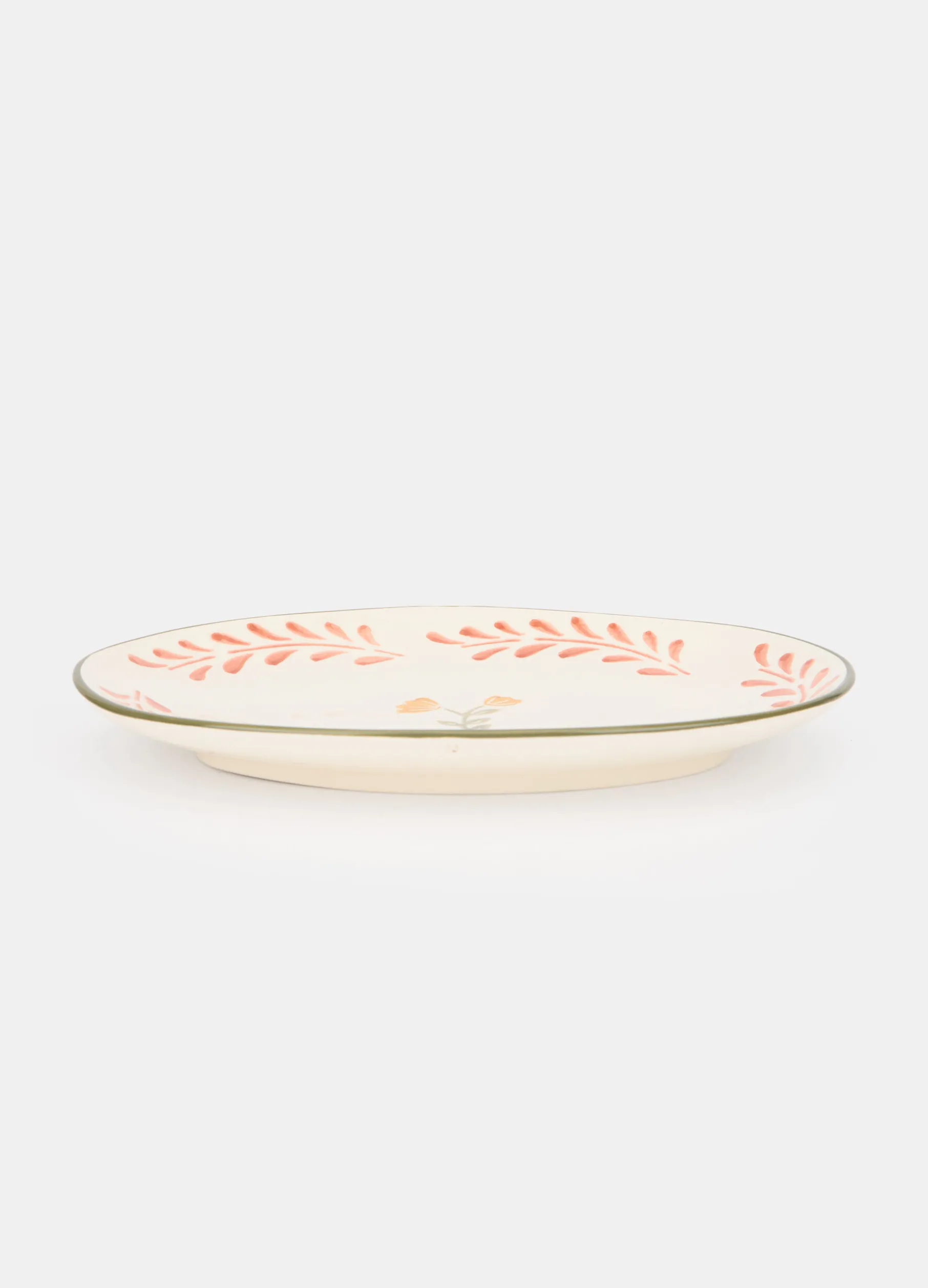 Piatto ovale da portata realizzato in ceramica spessa e resistente, dalla ricercata colorazione bianco avorio. La decorazione floreale in tonalità a contrasto è completata dal bordo verde che segna il profilo. Dimensioni: 30 x 21 cm.