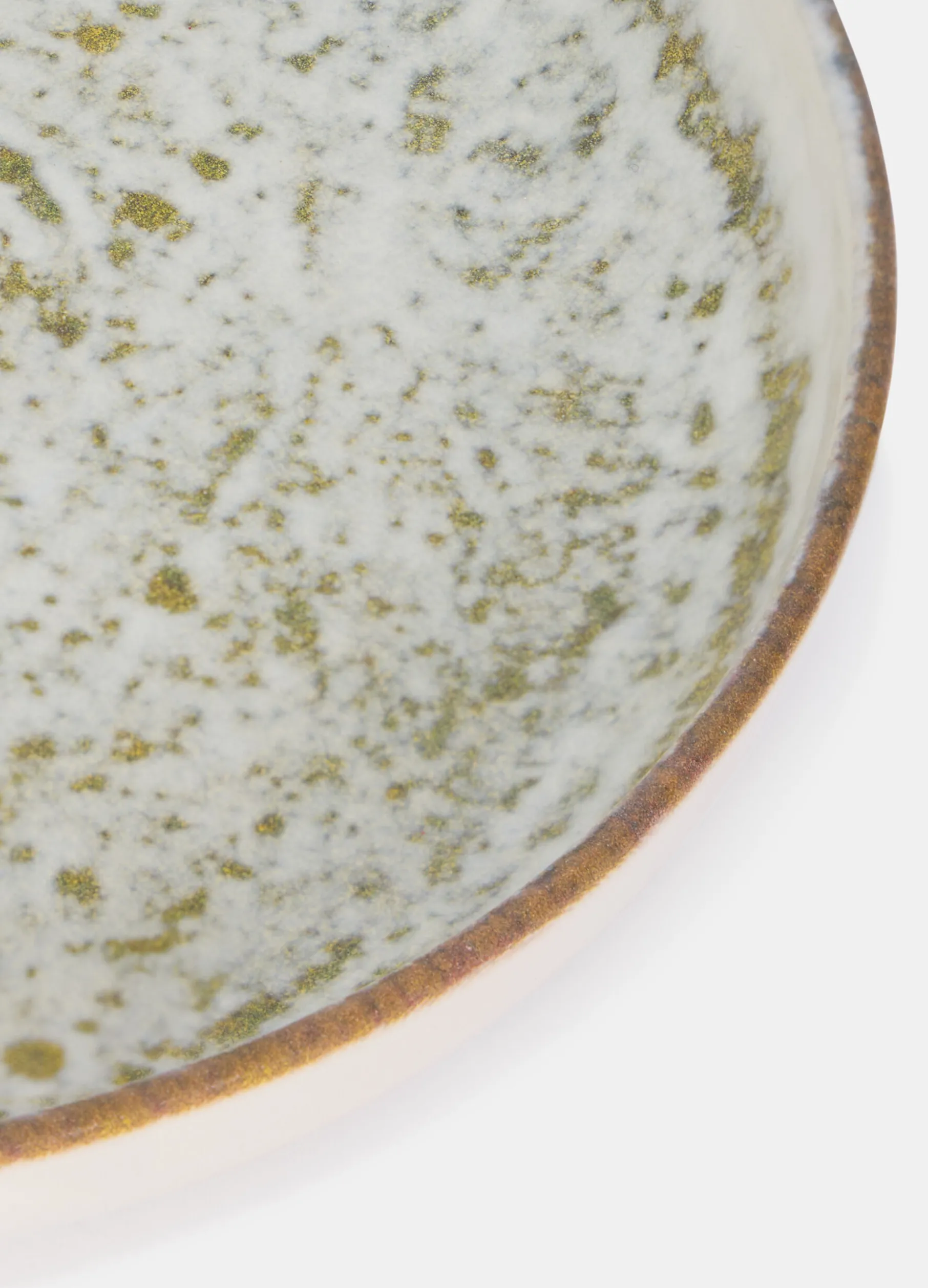 Piatto piano in gres, proposto in un’elegante tonalità verde sfumata, con lato esterno chiaro e bordo a contrasto. Diametro 22 cm.