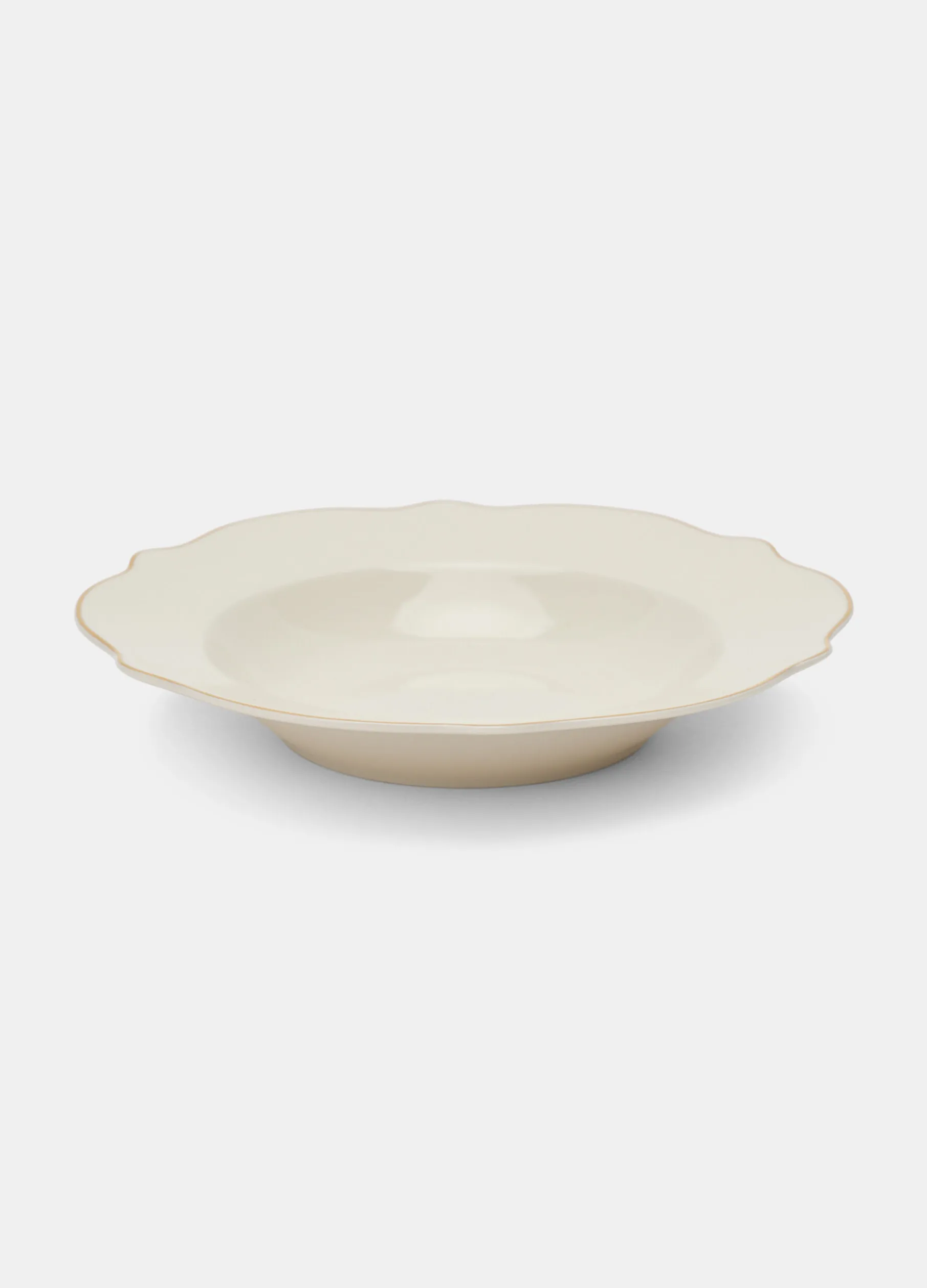 Piatto fondo con bordo ondulato, parte del servizio tavola coordinato, realizzato in porcellana bone china, caratterizzata dalla colorazione avorio, maggiore resistenza e un aspetto leggermente traslucido. Completato da profili dorati. Diametro: 20 cm.