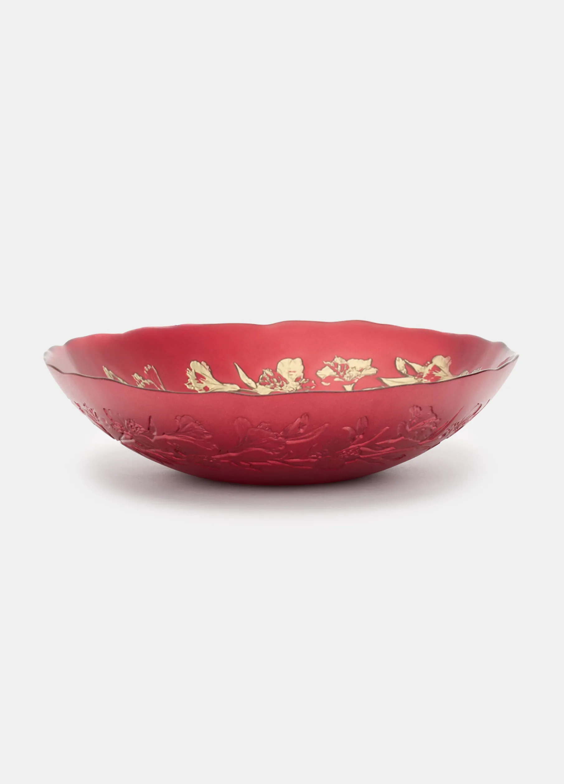 Piatto fondo alto e capiente realizzato in vetro rosso intenso e profondo e arricchito dal motivo floreale dorato che segna il bordo leggermente ondulato. Diametro: 26 cm.