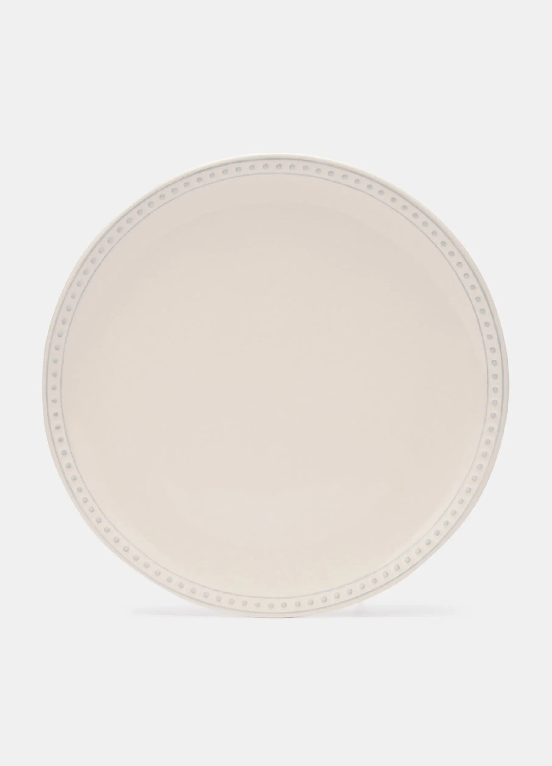 Piatto piano rotondo in ceramica lucida, declinata in una delicata tonalità di bianco avorio, per uno stile classico e senza tempo. Completato lungo il bordo con un profilo a contrasto. Diametro: 27,5 cm.