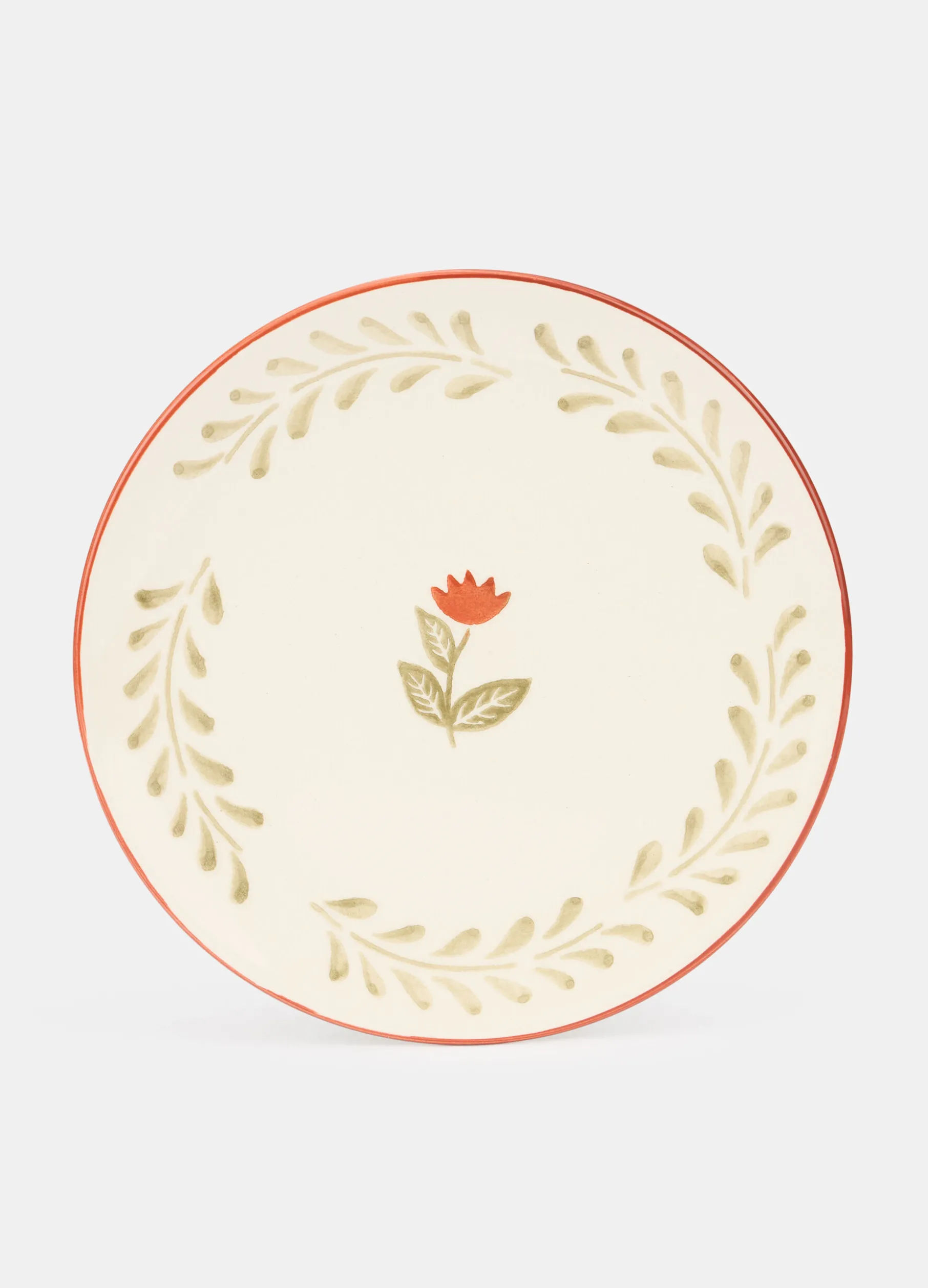Ampio piatto piano realizzato in ceramica spessa e resistente dalla ricercata colorazione bianco avorio. La decorazione floreale in tonalità a contrasto è completata dal bordo rosso che segna il profilo. Diametro: 26 cm.