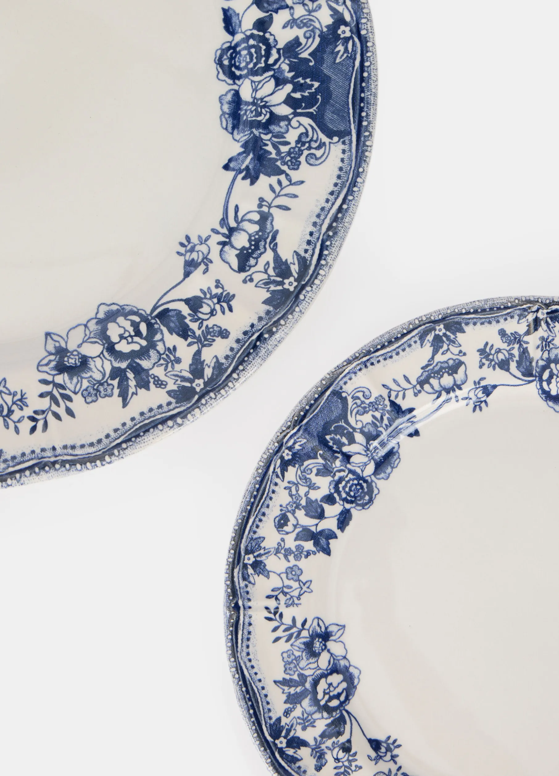 Piatto piano dal fascino classico in ceramica bianca, arricchito da un bordo con delicati fiori blu scuro. L’accessorio da tavola, realizzato in Italia, è abbinato al set con piatto fondo e piano. Diametro: 27 cm.