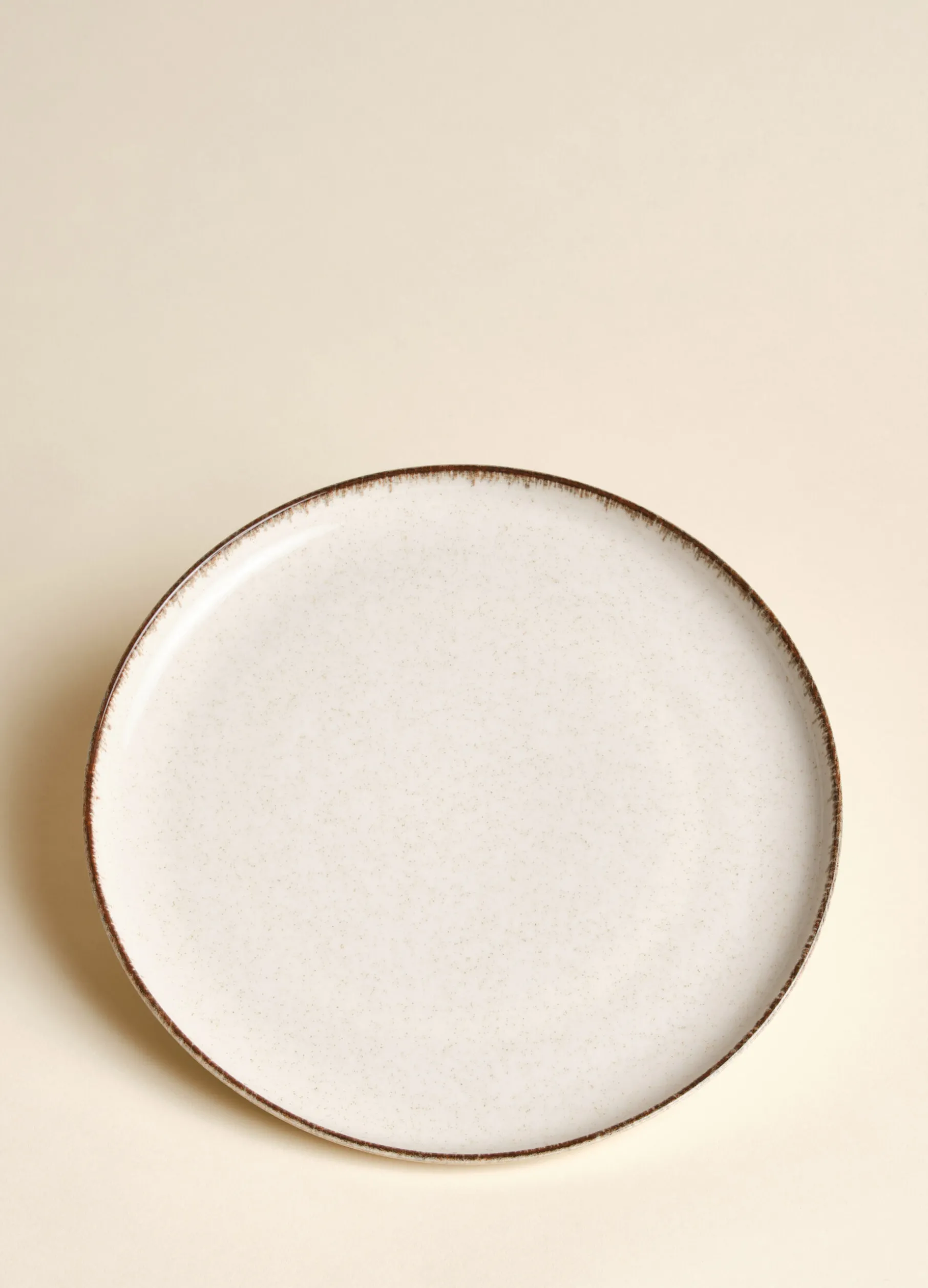 Piatto piano in porcellana puntinata con bordo a contrasto. Diametro 27 cm.