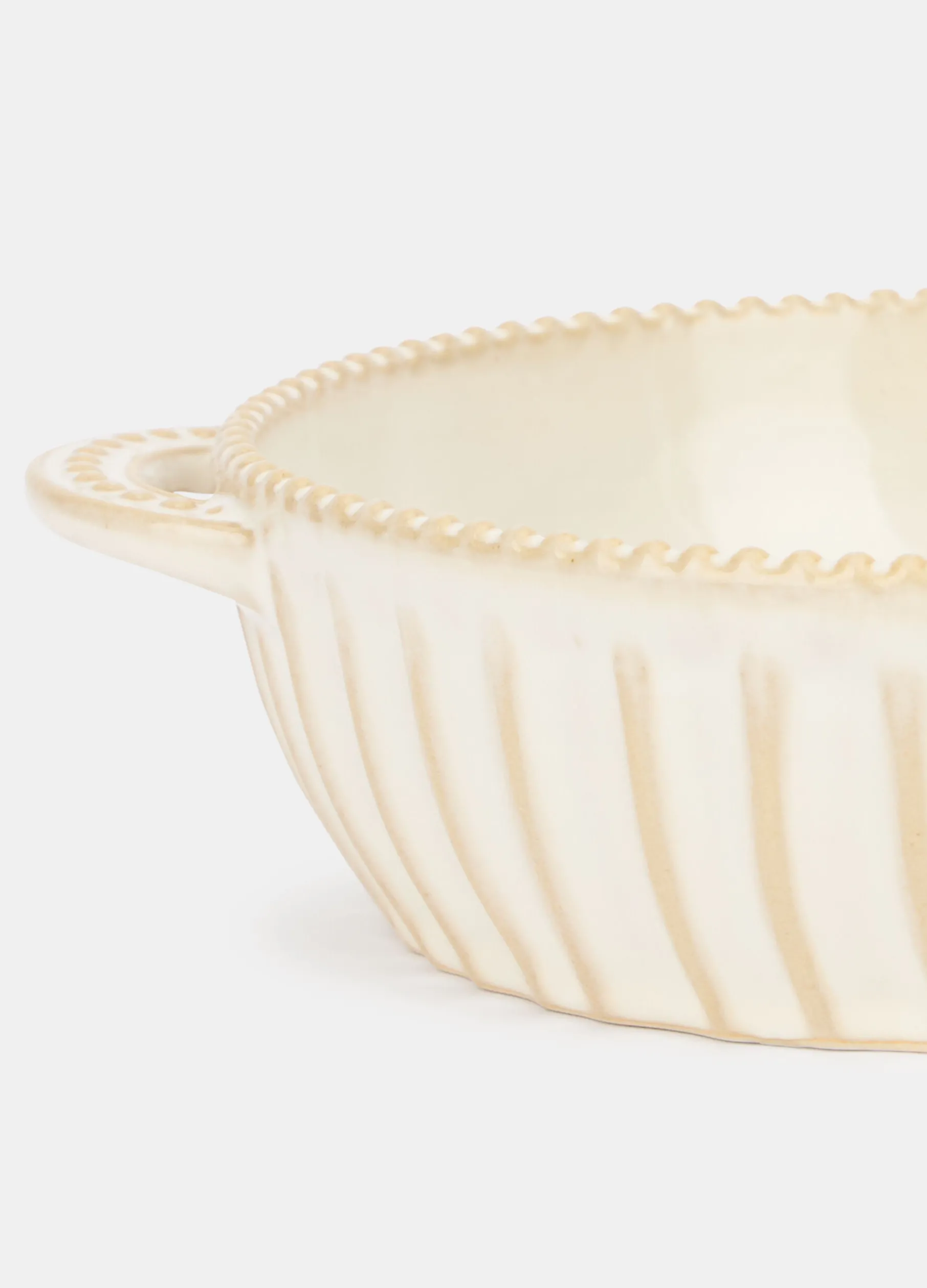 Pirofila elegante realizzata in ceramica bianco avorio con scanalature esterne in una tonalità più scura, che creano un effetto tridimensionale. Ideale per torte salate e sformati, è completata da due manici laterali. Diametro 21 cm; altezza: 5 cm.