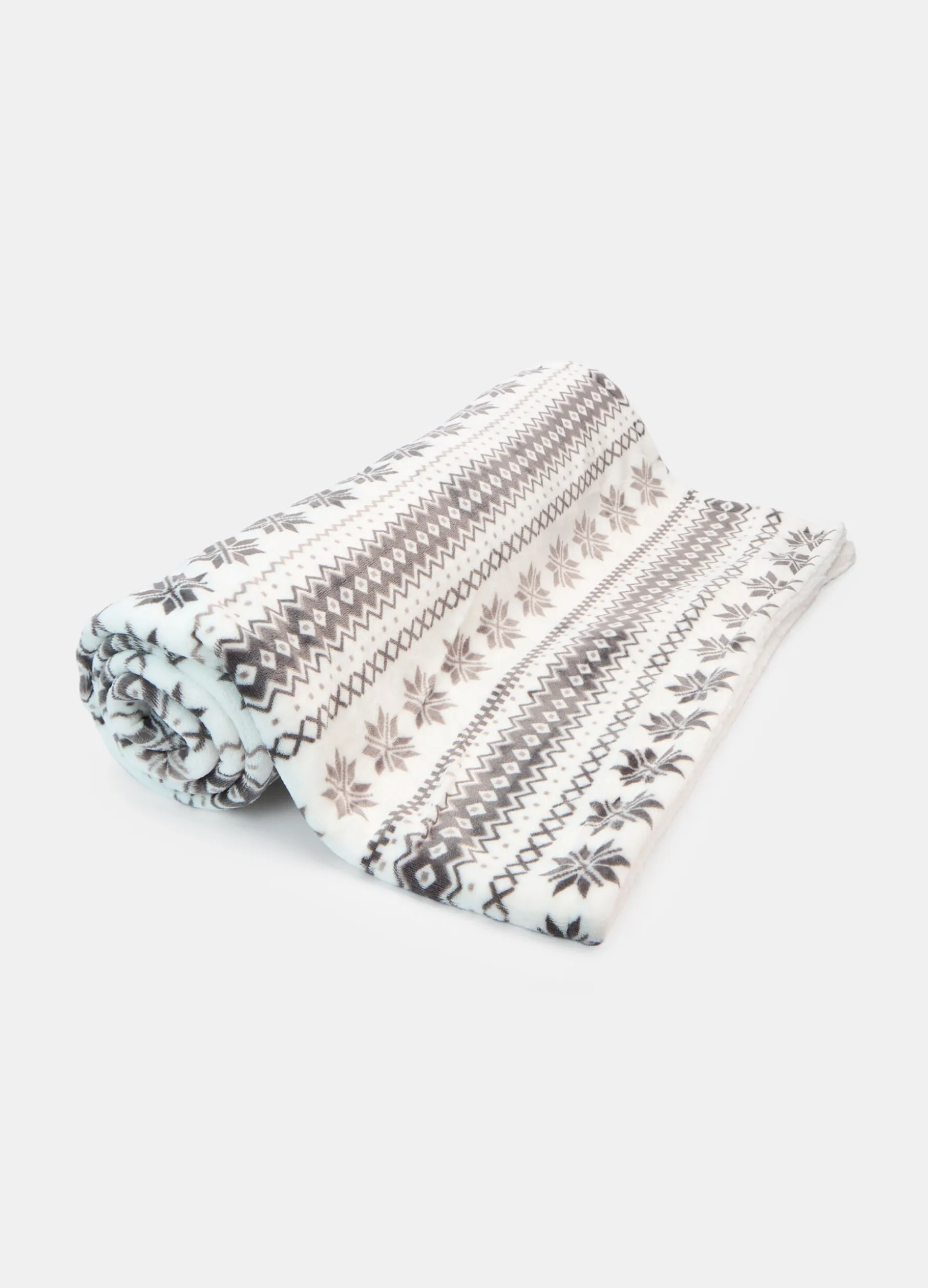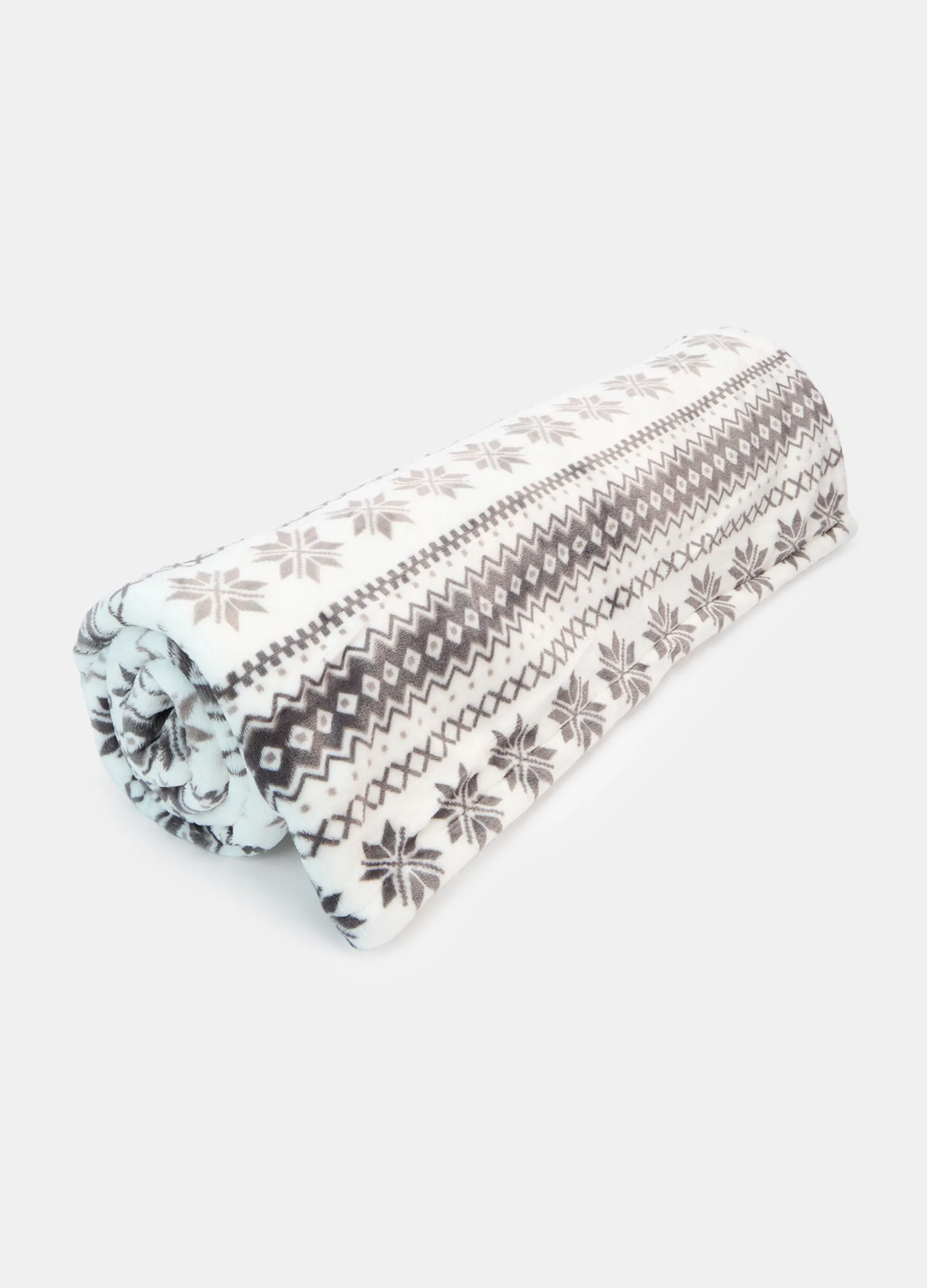 Plaid caldo e avvolgente dal look natalizio grazie alla luminosa tonalità di bianco su cui spicca il motivo decorativo grigio, ispirato ai classici maglioni norvegesi. La texture morbida e fluida del tessuto ricorda sulla pelle le sensazioni del velluto. Dimensioni: 160 x 130 cm.