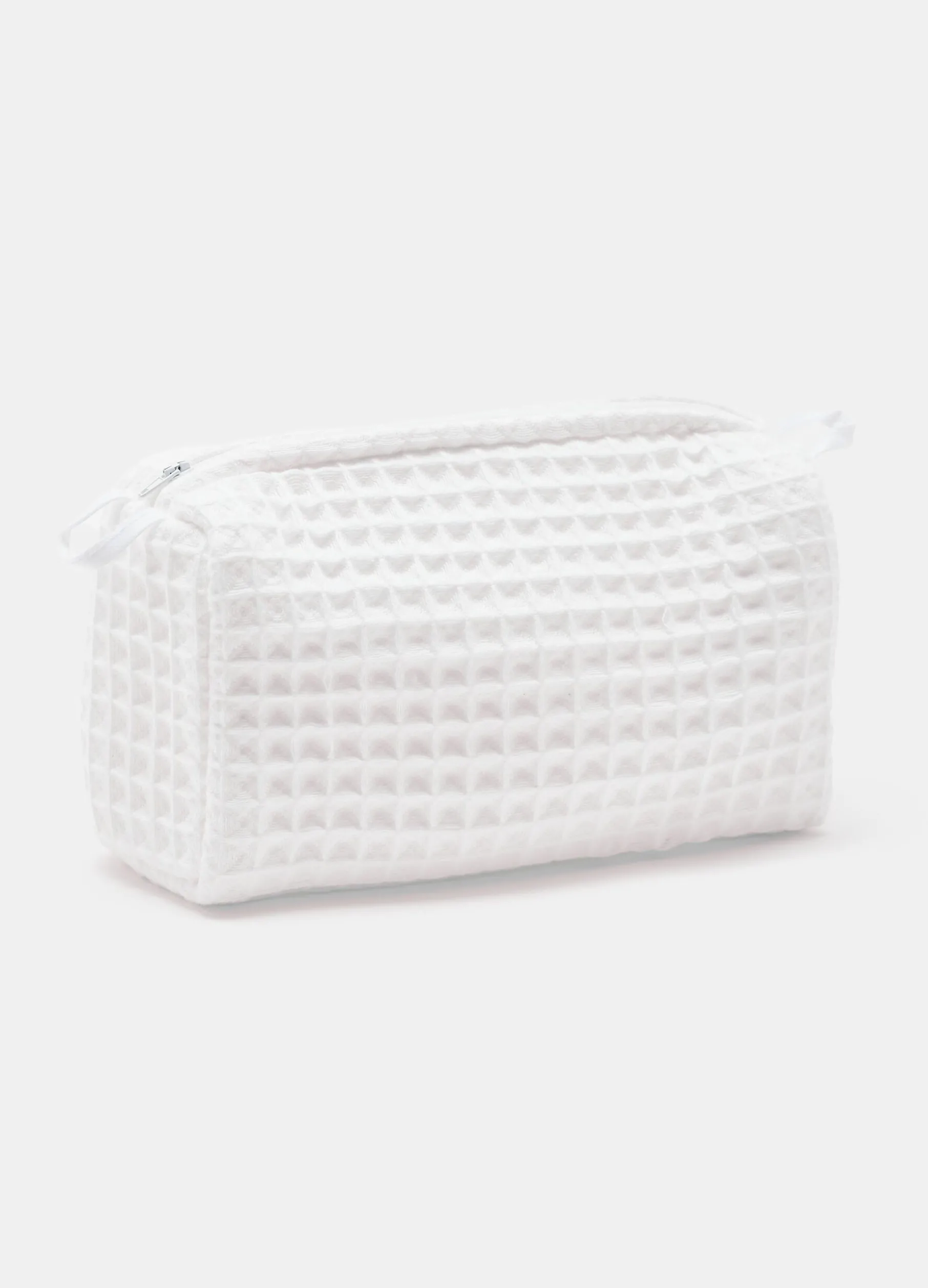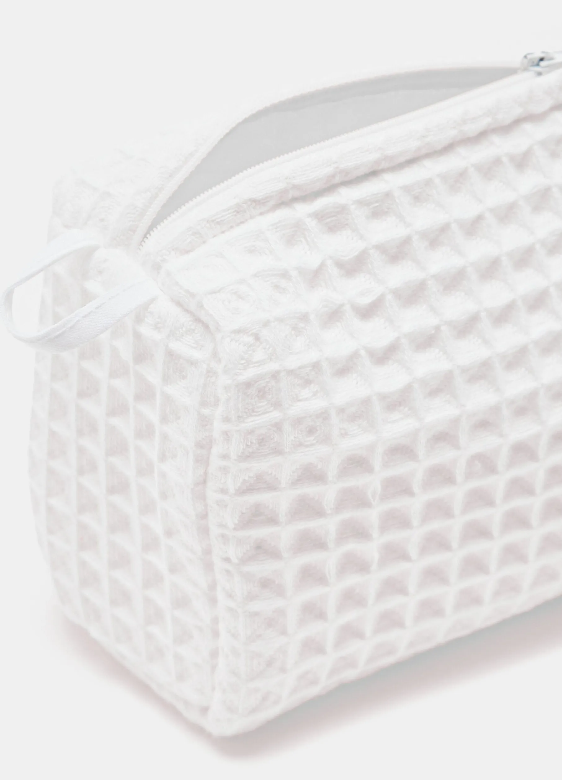 Pochette da bagno in puro cotone a nido d’ape con apertura a zip. Dimensioni 15x20x5cm. Made in Portogallo.
