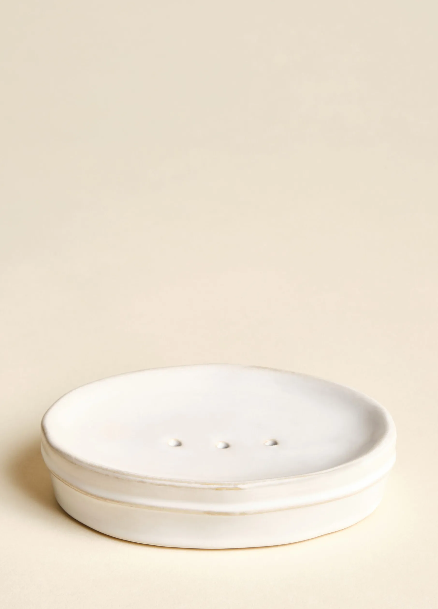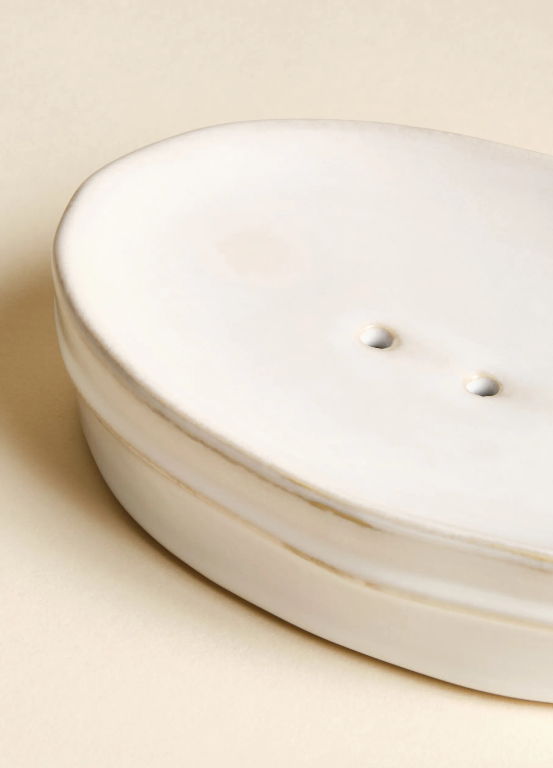 Porta saponetta ovale in ceramica bianco avorio con un caratteristico effetto anticato sui bordi e fori per evitare il ristagno d’acqua. Dimensioni: 8,6 x 12,5 x 3,3 cm.