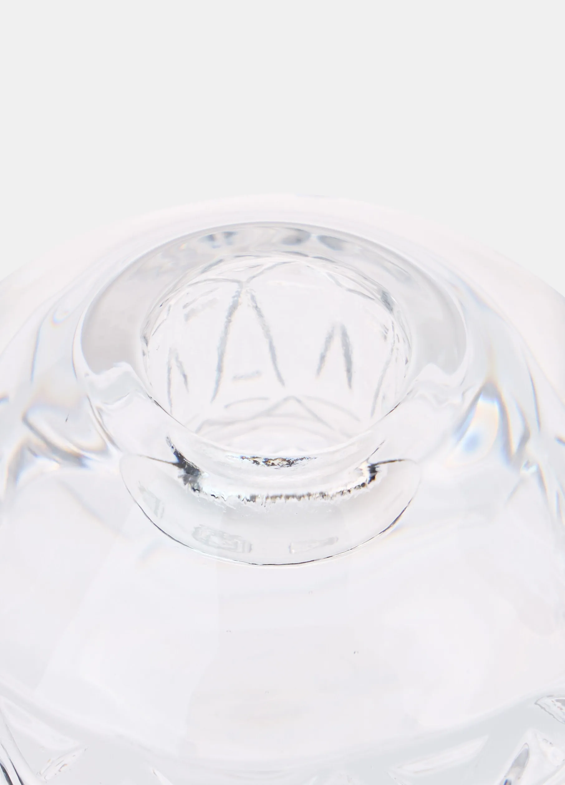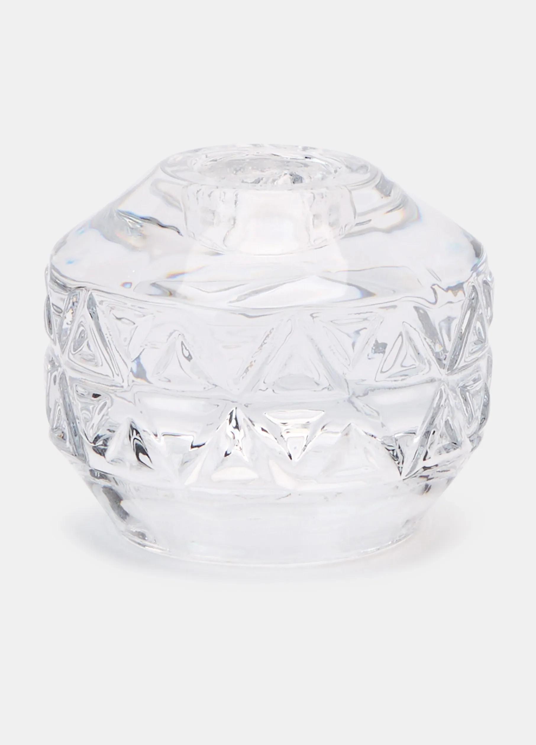 Base portacandela per candele singole e sottili, realizzato in vetro trasparente e decorato da un semplice motivo inciso lungo tutto il profilo. Altezza: 6 cm; diametro: 7 cm.