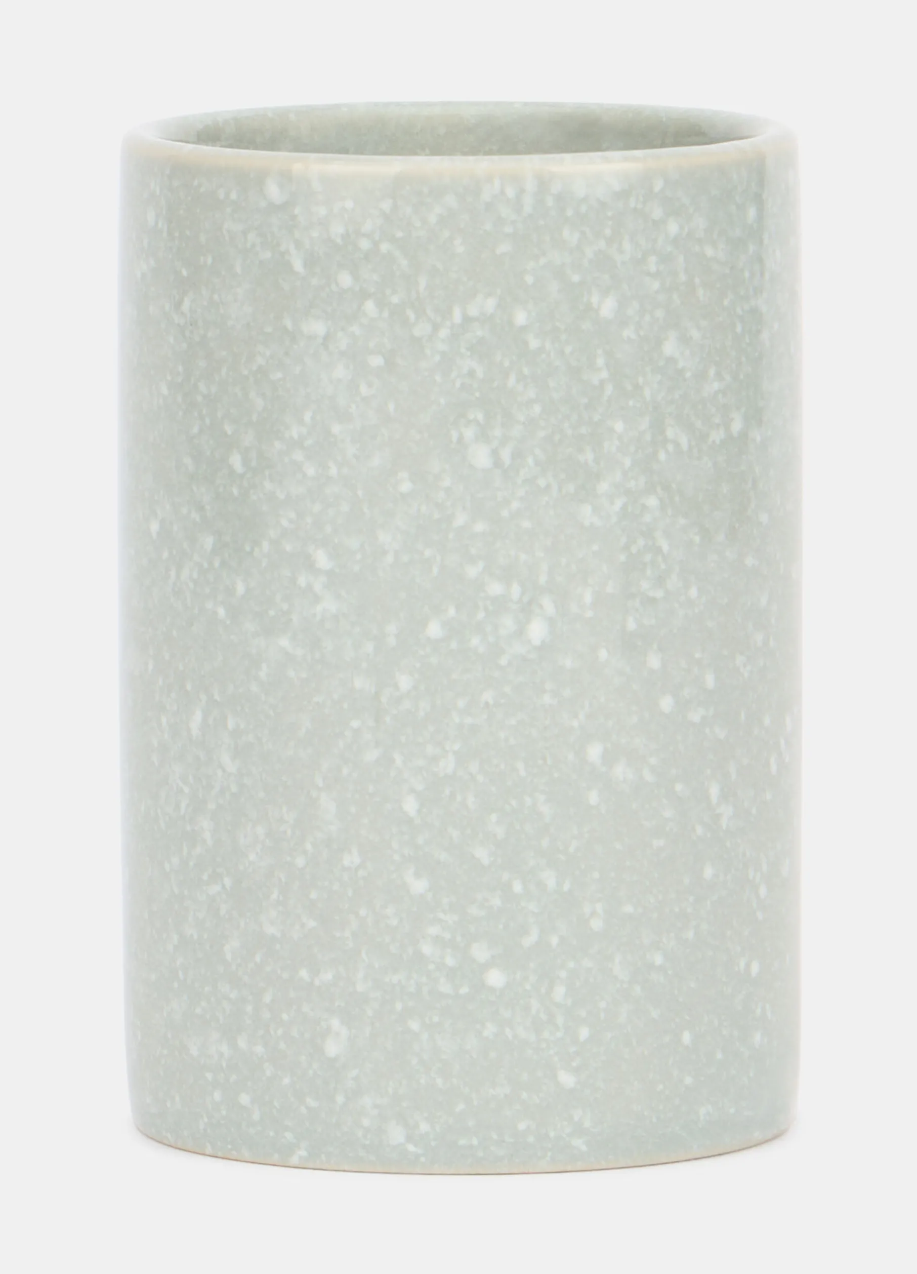 Bicchiere portaspazzolini rotondo realizzato in un materiale discreto e ricercato: la ceramica grigio chiaro ha un motivo screziato che ricrea l’effetto delle graniglie. Diametro: 8; altezza: 11,5 cm.