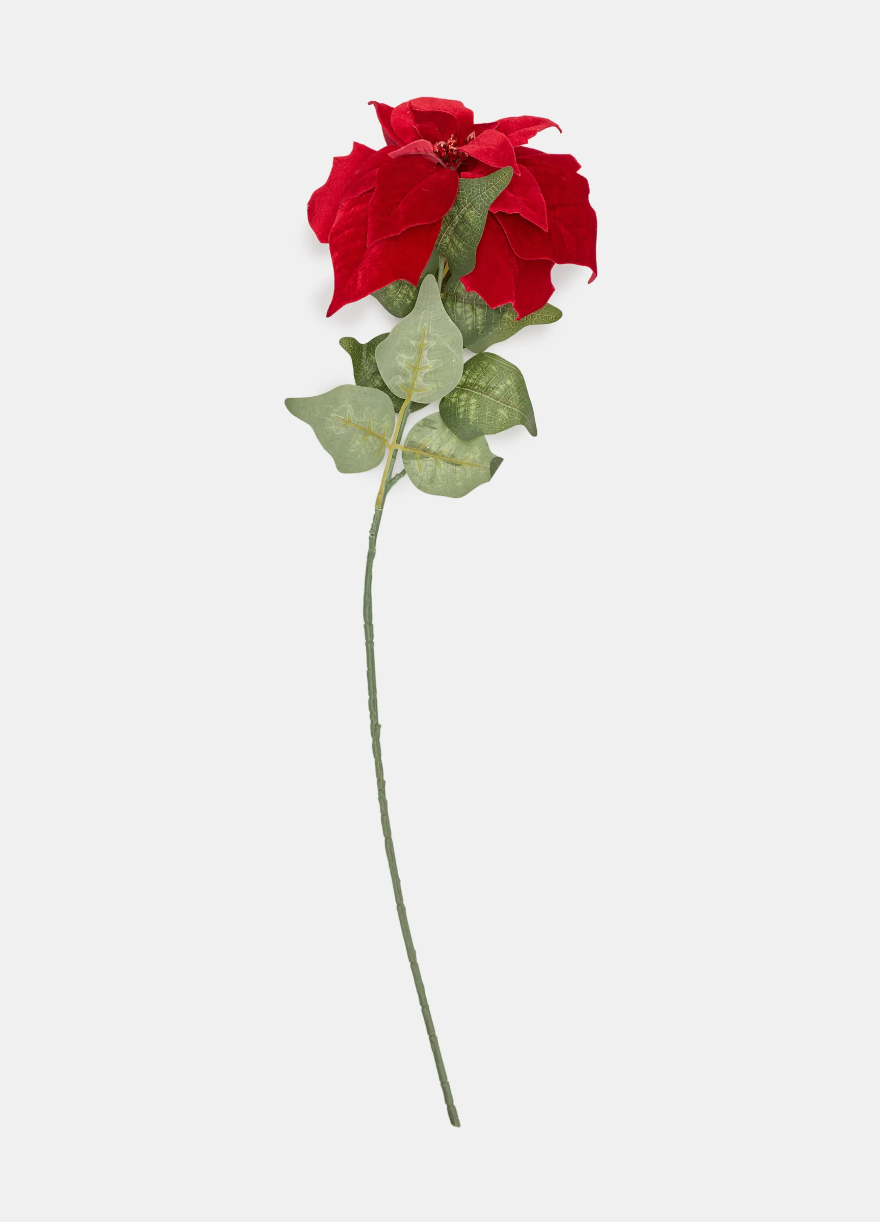 Fiore finto decorativo ispirato alla stella di Natale con lungo ramo verde, foglie ampie e una ricca corolla di petali rossi e vellutati, arricchiti da un tocco di glitter. Altezza: 75 cm; diametro: 25 cm.