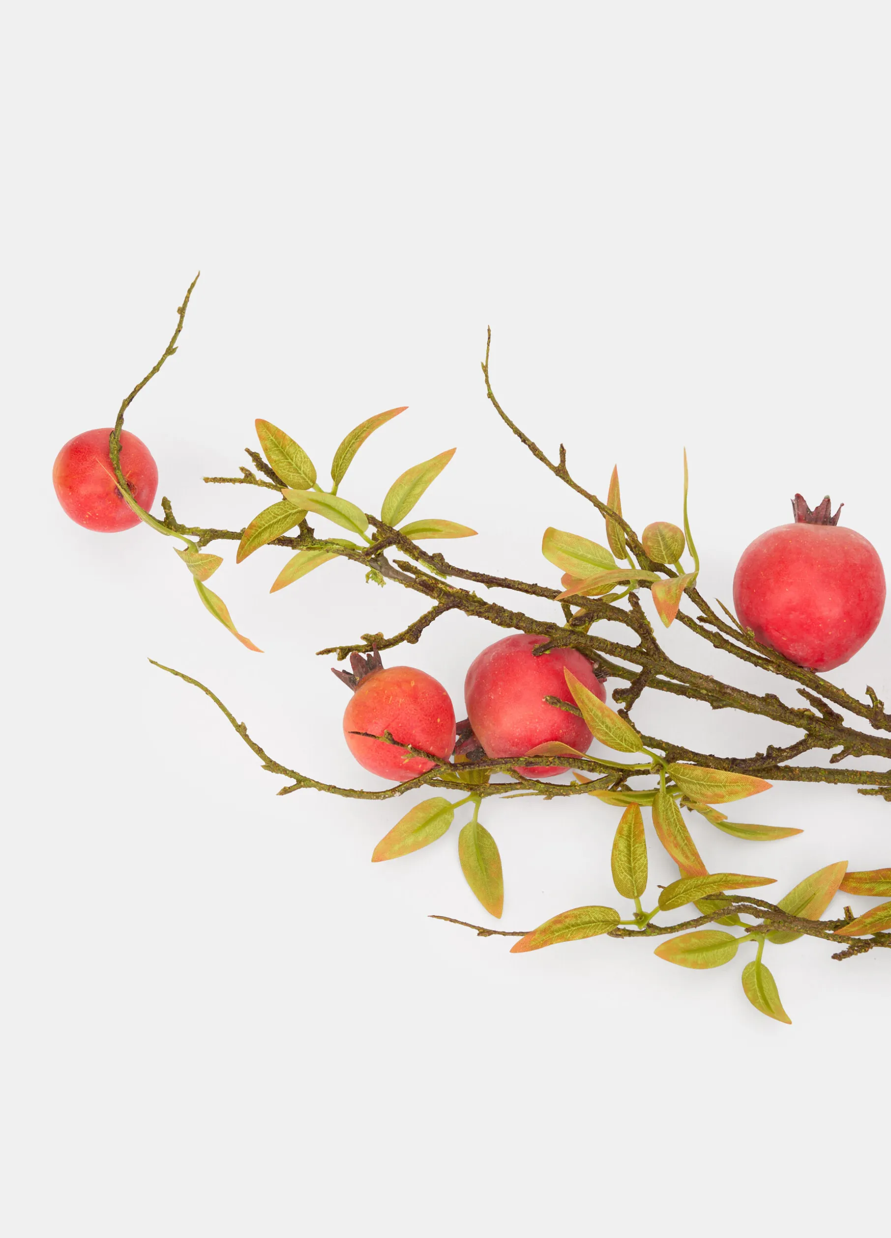 Esile ramo di melograno completo di foglie verde chiaro e dei frutti rosso sbiadito dalla forma inconfondibile, simbolo dell’autunno. Lunghezza: 90 cm.