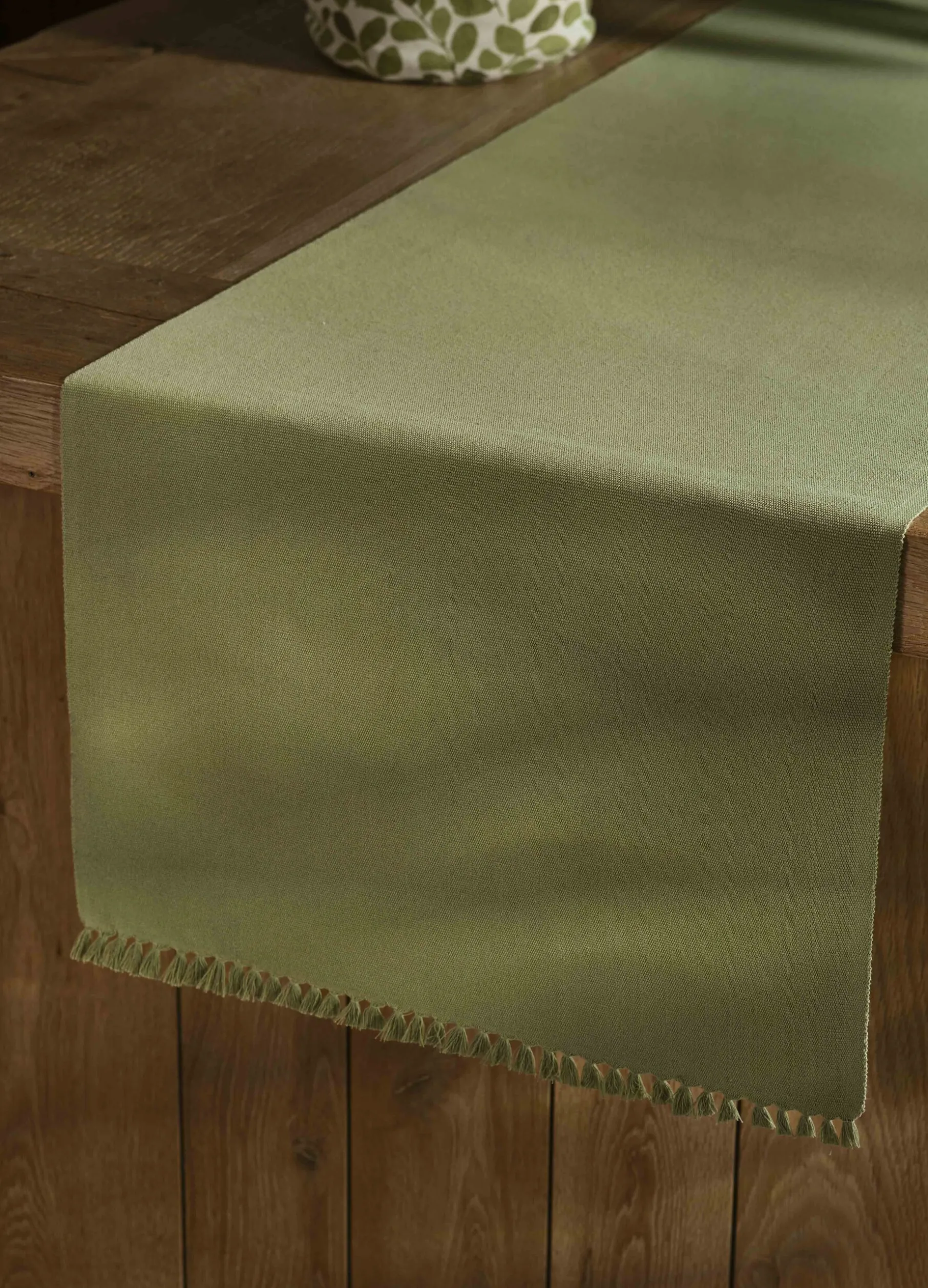 Runner rettangolare, ideale per il tavolo della cucina o della sala, realizzato in puro cotone biologico dalla trama grezza e resistente in verde chiaro. Con frange annodate sui lati corti. Dimensioni: 140 x 45 cm.