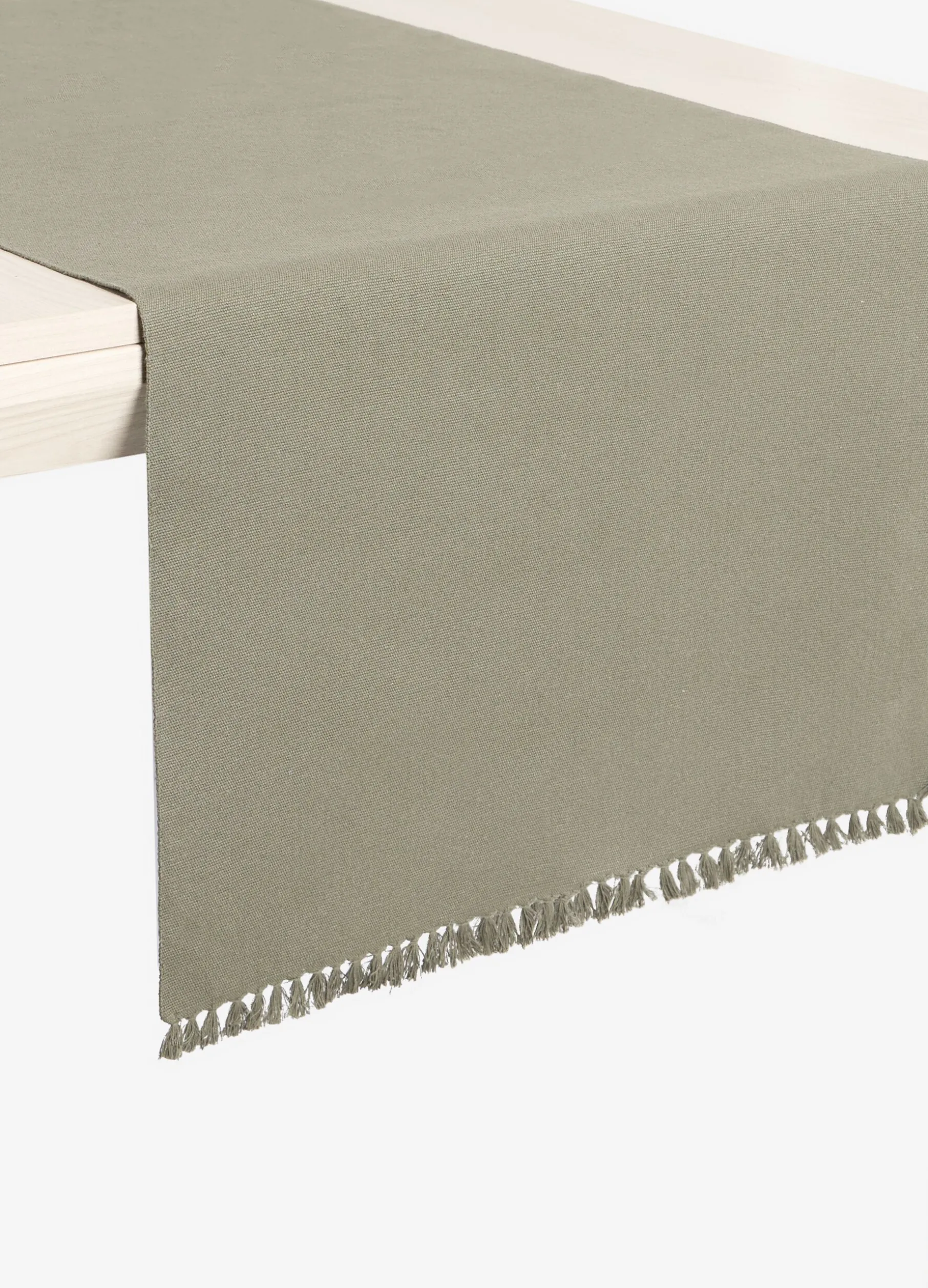 Runner in cotone biologico con nappine ai bordi. Tinta unita. Dimensioni 140×45 cm.